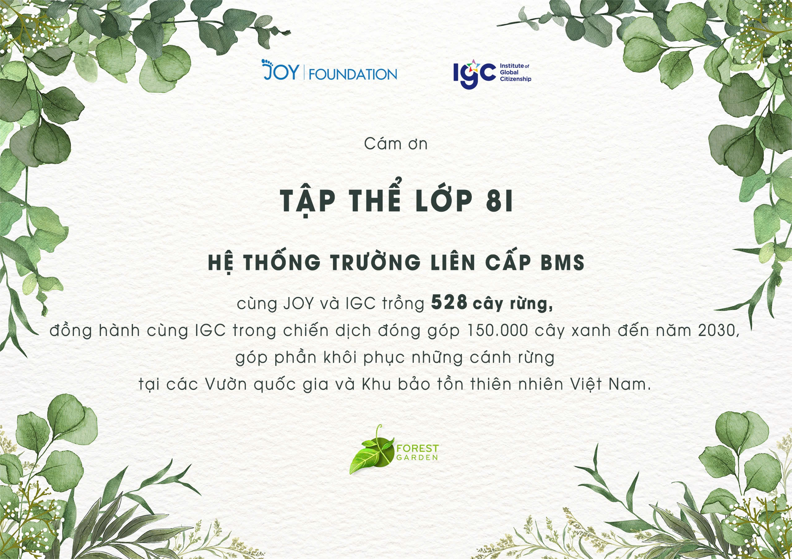 BMS xin gửi lời cảm ơn chân thành tới Tập đoàn IGC – đơn vị khởi xướng chương trình với tâm huyết và tầm nhìn vì môi trường và giáo dục. Joy Foundation và Ban Quản lý Vườn quốc gia Tà Đùng – những người bạn đồng hành đáng quý trong tổ chức, kết nối và lan tỏa hoạt động. Tập thể Thầy cô, Cha mẹ, học sinh cộng đồng BMS – những người góp công, góp sức và gieo yêu thương thông qua từng cây được trồng, từng hành động được thực hiện.
