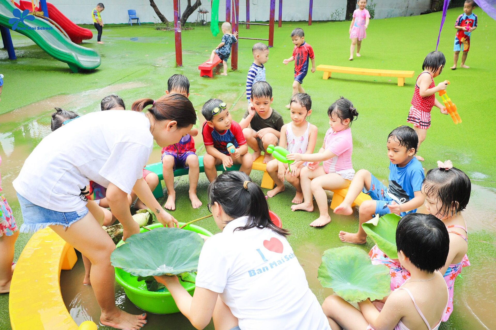 Tại Đồi cỏ, một Công viên nước cực kỳ ngộ nghĩnh đã được các thầy cô giáo công phu thiết kế. BMSers nào cũng thích thú trải nghiệm những Thuyền lá cau, Vòi phun bạch tuộc, Con đường băng giá, Đại chiến bóng nước…
