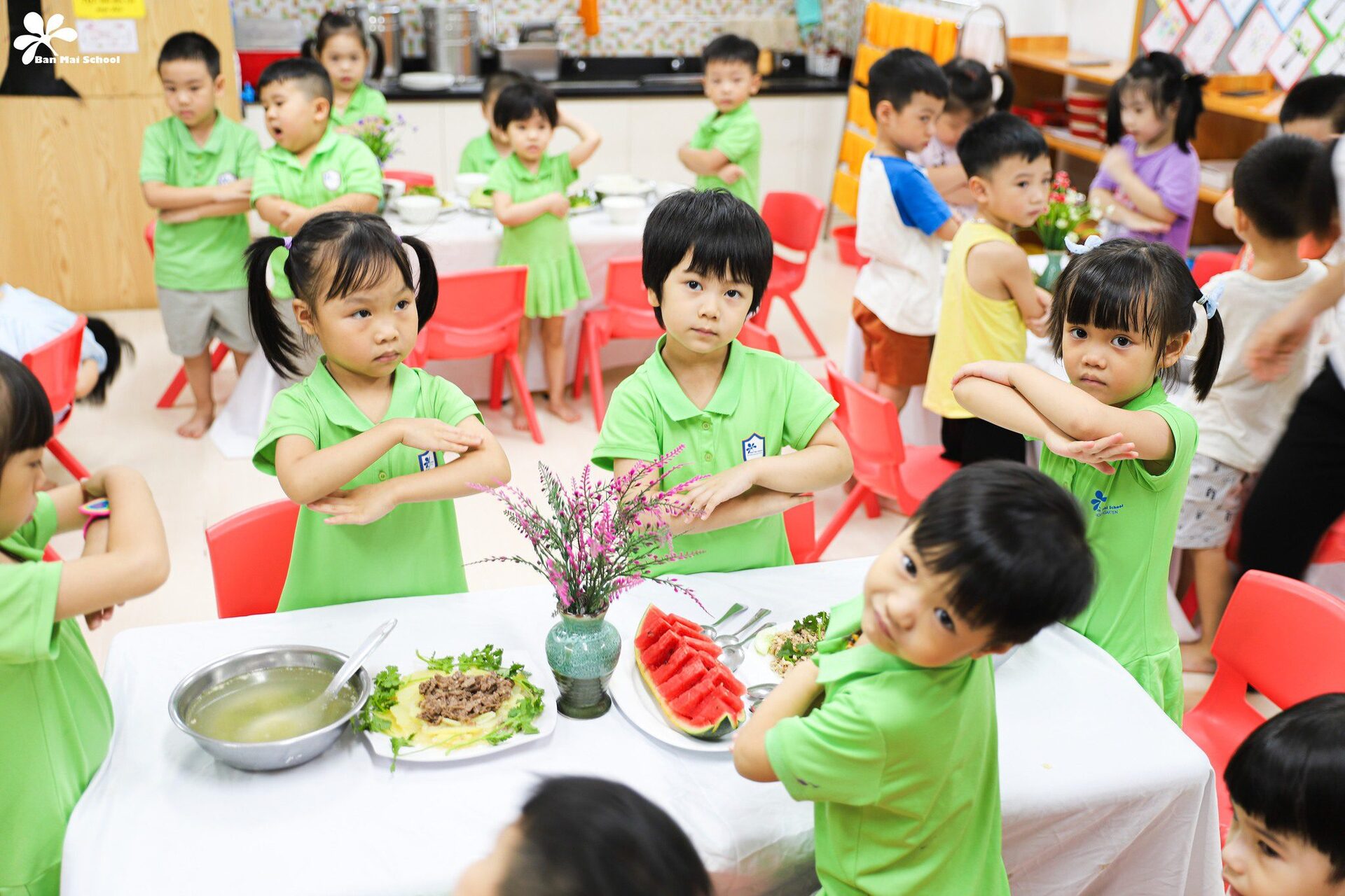 Bên cạnh chế độ dinh dưỡng được xây dựng chuyên biệt cho trẻ ở từng lứa tuổi, những giờ ăn hạnh phúc tại Ban Mai cũng là dịp để BMSers hình thành thói quen và kỹ năng tự phục vụ.