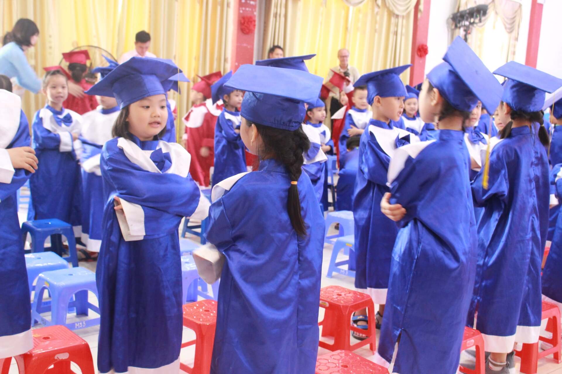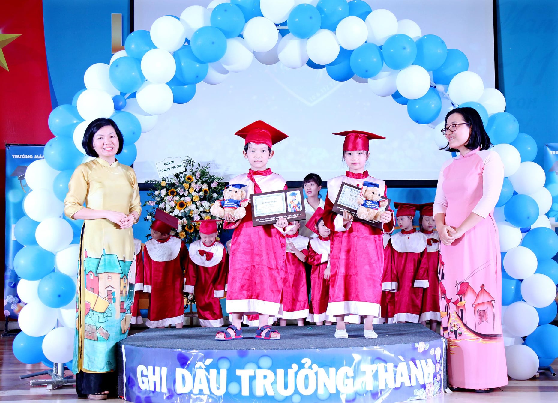 Gương mặt rạng rỡ của các bé khi lên nhận bằng chứng nhận hoàn thành chương trình mẫu giáo. Đại diện Ban Giám hiệu nhà trường và Ban Phụ huynh trực tiếp lên trao bằng, chúc mừng từng bé.