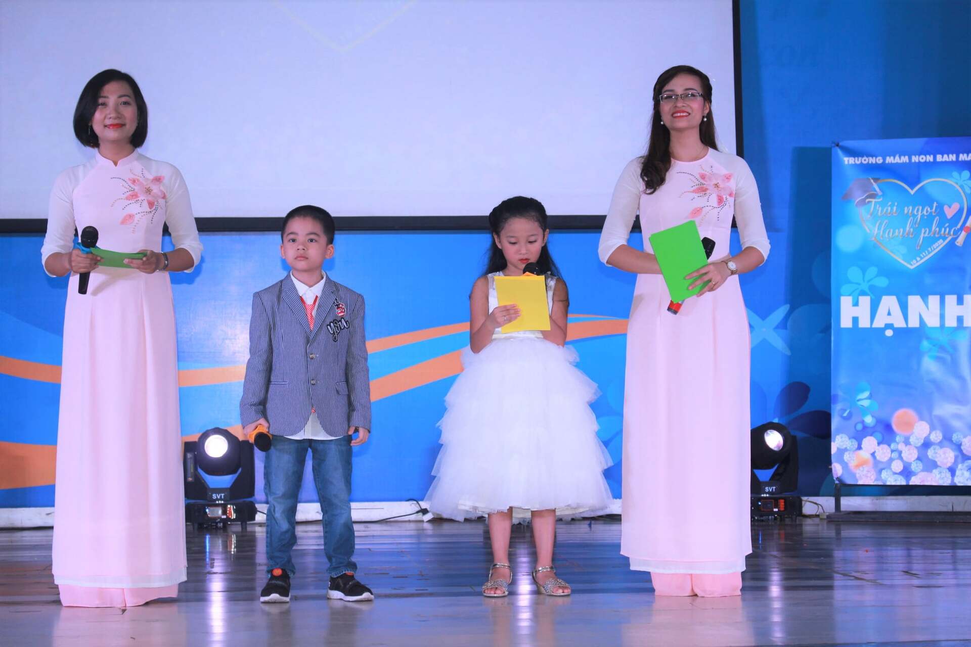 Dù mới ở lứa tuổi mầm non nhưng các bé đã rất tự tin, bản lĩnh thể hiện vai trò dẫn chương trình bằng cả tiếng Việt và tiếng Anh. Đây cũng là thành quả của việc đưa các chương trình giáo dục như Tlim, Cambridge vào giảng dạy tại nhà trường.