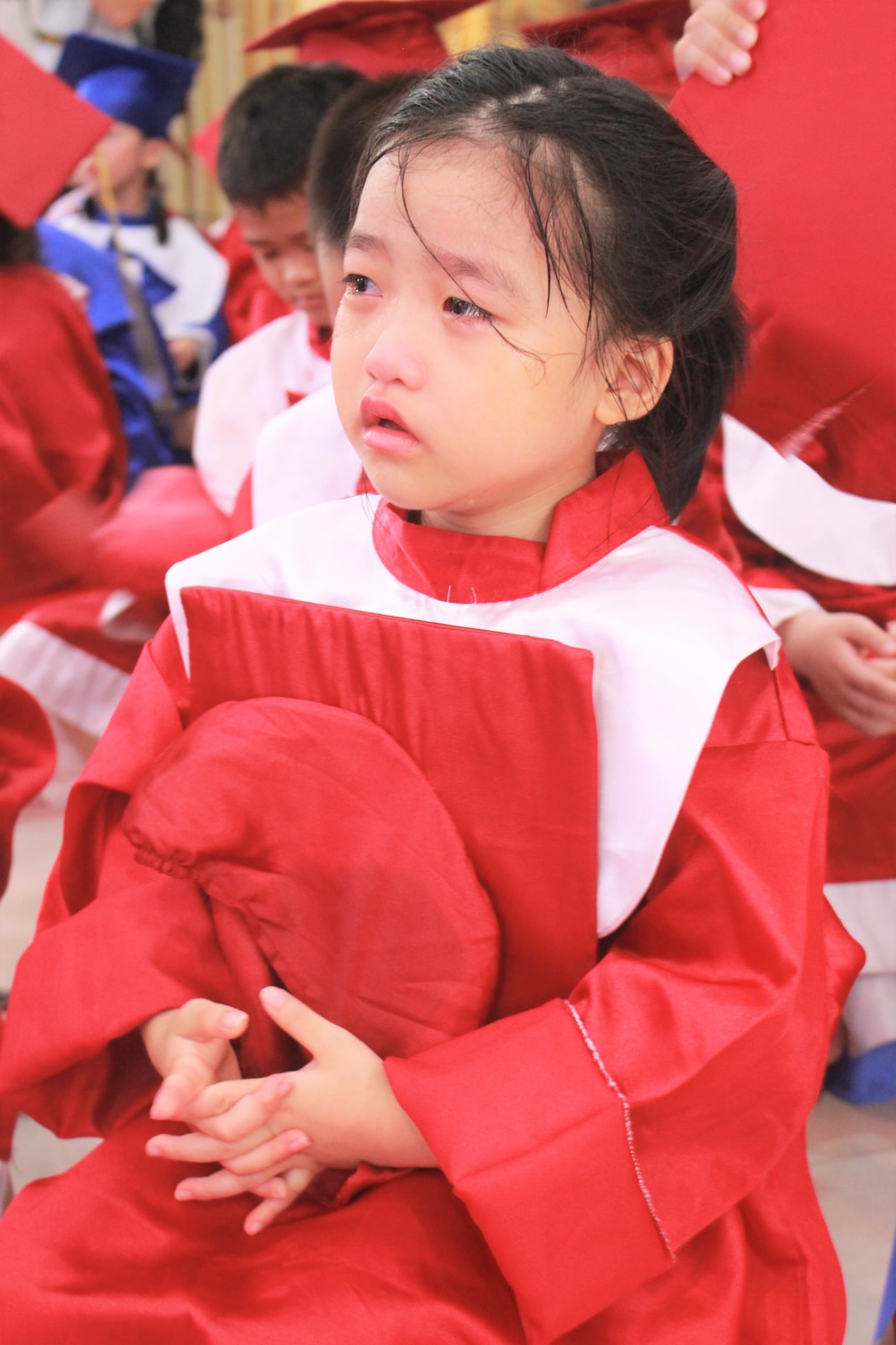 Một bé gái òa khóc khi biết sắp phải chia tay bạn bè, thầy cô.