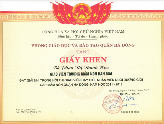 Xin chúc mừng trường Mầm non Ban Mai, chúc mừng cô giáo Phan Thị Thanh Hoa và các cô, các bé lớp Mickey 3.