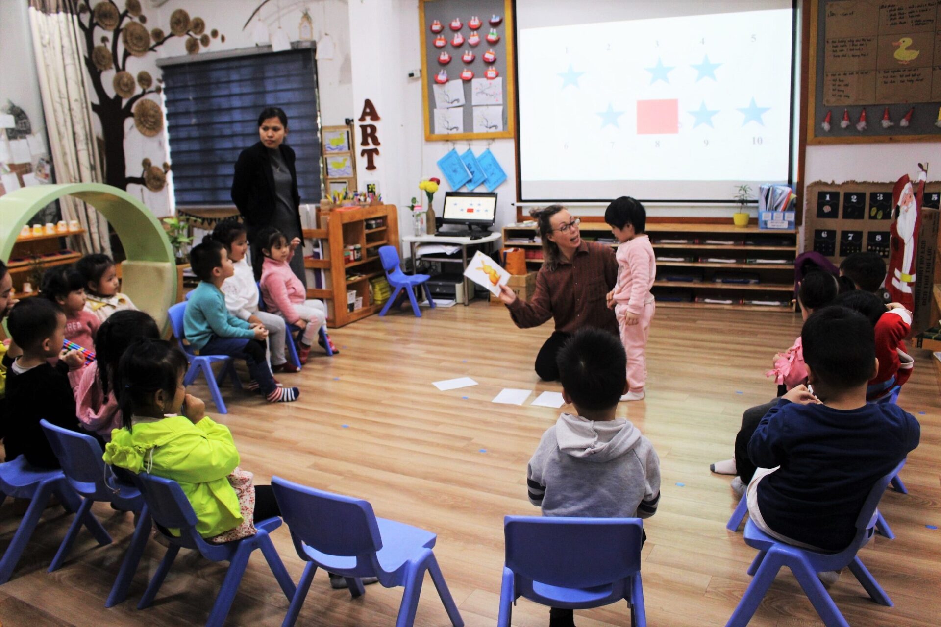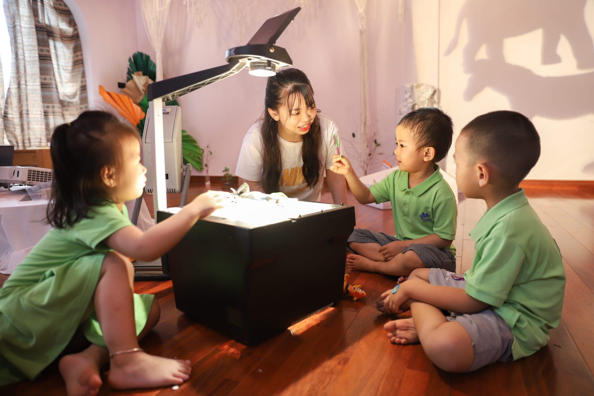 Với nguyên tắc “không ai bị bỏ quên” và lấy trẻ làm trung tâm, tất cả các hoạt động trong lớp học đều nhằm mục tiêu tạo tối đa cơ hội cho trẻ được thực hành nghe – nói – nhận biết. Các chủ đề gần gũi truyền cảm hứng giúp trẻ đưa ra các phỏng đoán, các câu hỏi của mình về chủ đề một cách say sưa và tự nhiên là cơ hội cung cấp cho trẻ từ mới liên quan đến lĩnh vực khoa học, toán học, động vật, thực vật, số lượng, hình dạng, kích thước. Cách học này cũng giúp phản xạ nghe – nói, thẩm thấu tiếng Anh của trẻ được phát triển, trẻ tự tin hơn khi sử dụng tiếng Anh trong cuộc sống hàng ngày.
