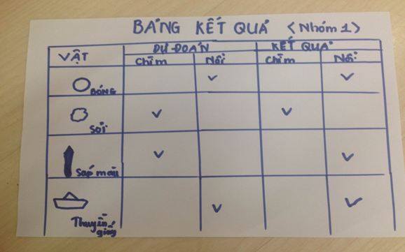 Và với bảng kết quả này , cô giáo đã giải thích cho chúng tớ tại sao khi thả đồ vật này vào nước thì nổi nhưng khi thả một đồ vật khác vào thì kết quả ngược lại là chìm