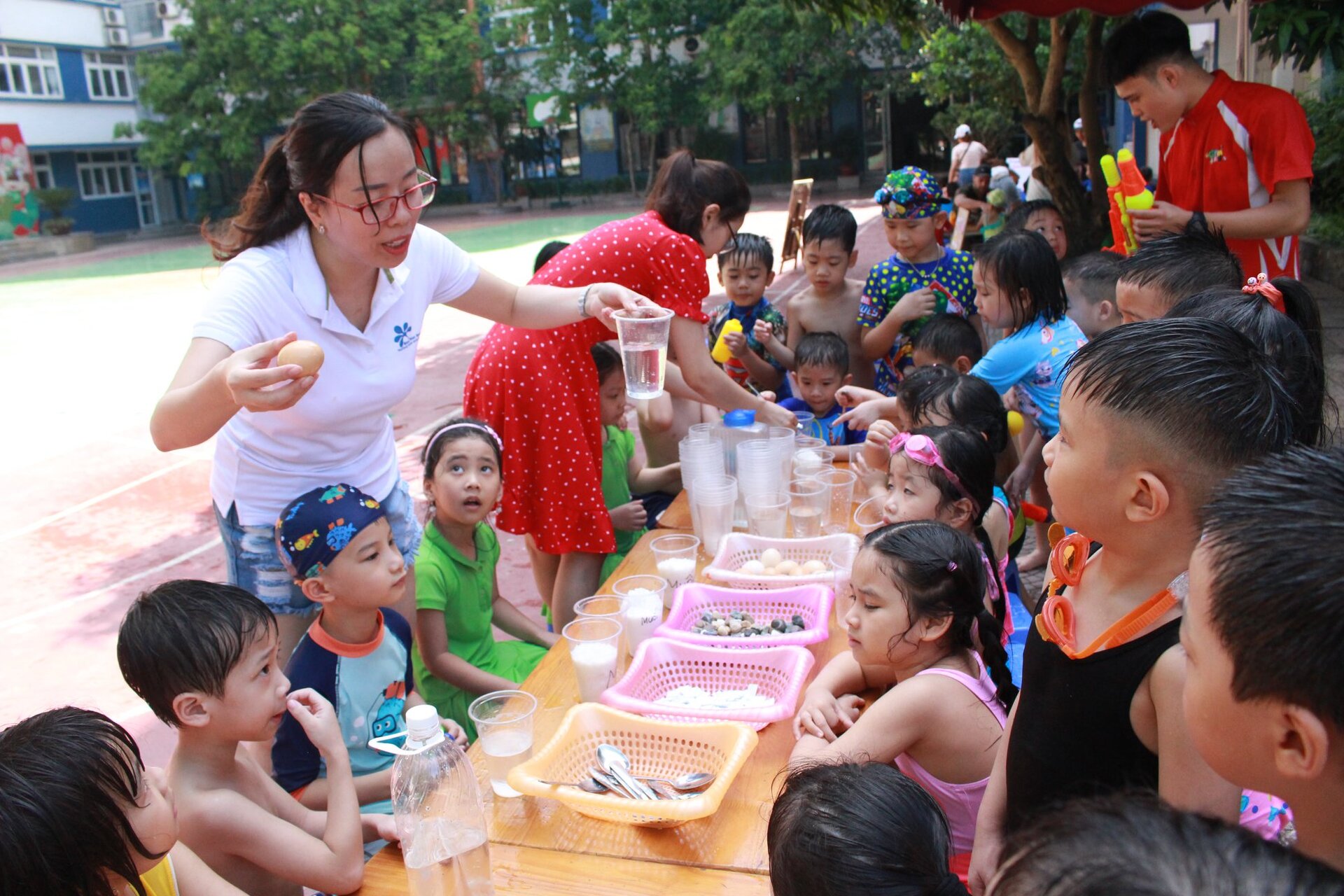 Bên cạnh đó, các bạn nhỏ được tham gia các trò chơi về nước như: Ném bóng nước, chuyển nước qua đầu, thảm trượt nước, con đường băng giá, thổi thuyền, câu cá, bắn súng, té nước, thổi bong bóng, khám phá đường đi của nước, vòi phun bạch tuộc…