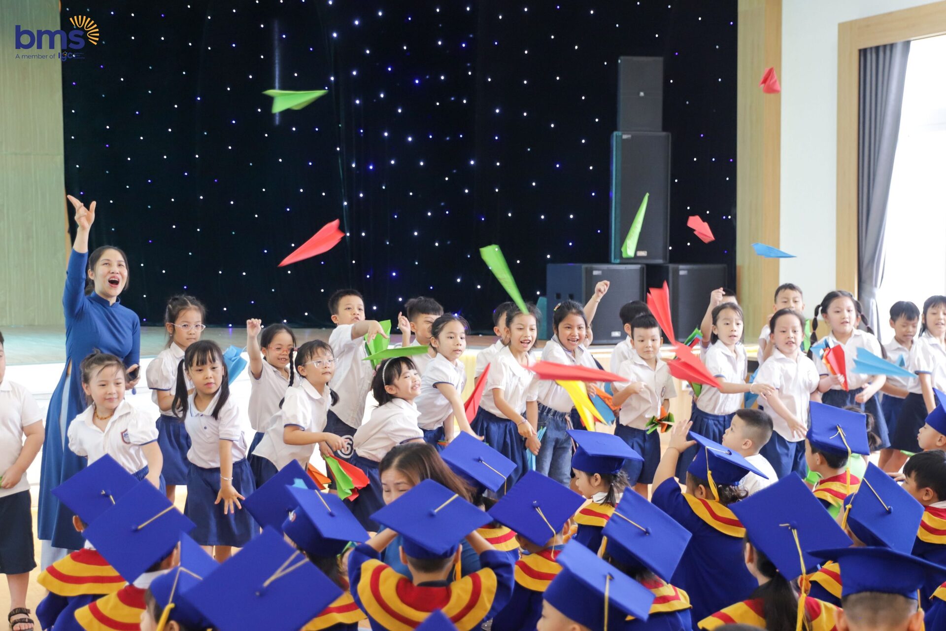 Bên cạnh đó, những chiếc máy bay giấy cũng được các anh chị Trường tiểu học Ban Mai phóng thẳng lên không trung, gửi gắm theo đó vô vàn những lời chúc, hi vọng, mong muốn các “tân cử nhân nhí” sẽ ngày càng tự tin, bay cao, bay xa trên bầu trời mơ ước.