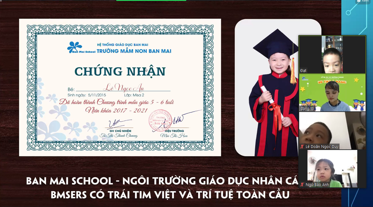 Lễ tri ân và trưởng thành năm nay được xem là ngày lễ đặc biệt nhất trong lịch sử của Ban Mai cùng các BMSers nhí. Tuy chỉ có thể tổ chức online nhưng Ban Mai tin rằng buổi lễ đã đem đến thật nhiều cảm xúc cho các con học sinh cùng ba mẹ. Các con đã được nhìn lại hành trình học tập của mình. Được lắng nghe những lời gửi gắm yêu thương từ các Ban giám hiệu nhà trường, các ba mẹ, các thầy cô là cán bộ giáo viên, nhân viên của nhà trường. Đặc biệt là cả những lời nhắn gửi ngọt ngào từ chính các bạn học và các cô giáo của lớp mình.