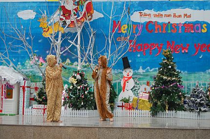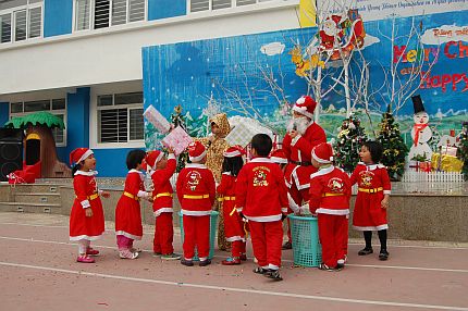 Và ngày Noel mong chờ đã tới. Ngay từ sáng sớm, các bé háo hức trong những bộ phần áo ông già Noel thật ngộ nghĩnh và đáng yêu. Cả sân trường dường như ấm lên khi buổi lễ bắt đầu với các tiết mục mừng lễ Giáng sinh khiến.