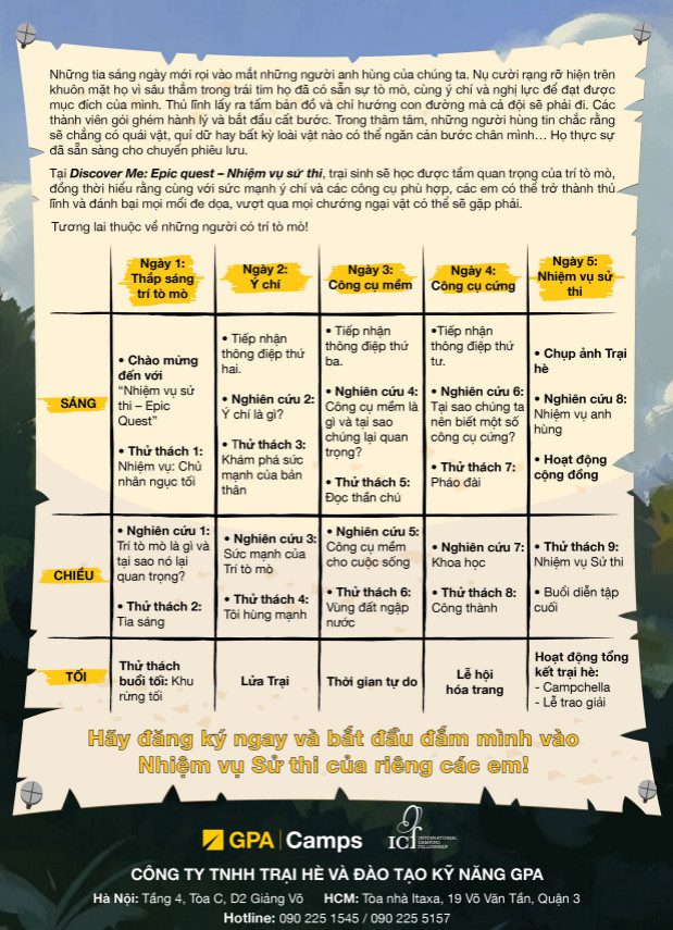Tại trại hè GPA DISOVER ME “EPIC QUEST – NHIỆM VỤ SỬ THI” – HÒA BÌNH , các học sinh sẽ hoạt động với cường độ cao, tuân theo kỷ luật nhóm, được học hỏi từ bạn bè và các anh chị tình nguyện viên như những hình mẫu, và đặc biệt được sự hướng dẫn của các giám đốc trại hè nhiều năm kinh nghiêm. Các em sẽ được học các nguyên tắc làm việc và phong cách sinh hoạt theo chuẩn mực quốc tế, từ đó hình thành thói quen văn minh và có trách nhiệm với mình, gia đình và bản thân.