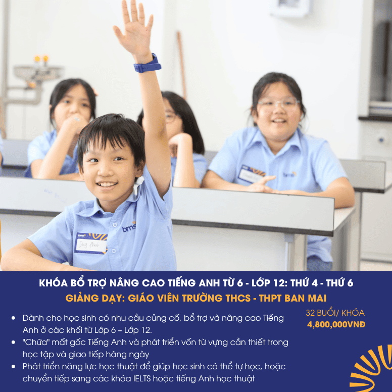 BMsers đã sẵn sàng chinh phục năm học mới với các khóa học After school cực chất? Khám Phá Đam Mê: Từ thể thao đến nghệ thuật, tìm kiếm và theo đuổi niềm yêu thích của bạn. Kết Nối Bạn Mới: Giao lưu, làm quen và học hỏi cùng những người bạn mới. Rèn Luyện Kỹ Năng: Phát triển kỹ năng giao tiếp, thuyết trình và nhiều kỹ năng quan trọng khác. Chuẩn Bị Tương Lai: Đạt chứng chỉ quốc tế và chuẩn bị cho các kỳ thi IELTS. Khám Phá Tiềm Năng: Tham gia các sân chơi học thuật và thể thao, thể hiện bản thân và tự tin bứt phá.