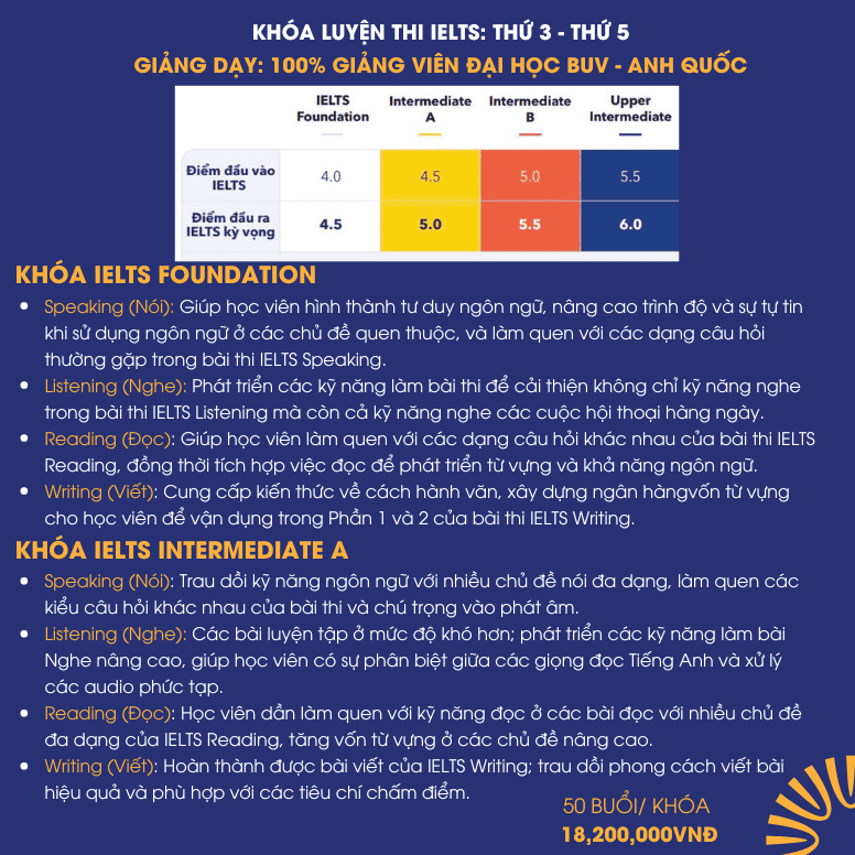 IELTS INTERMEDIATE A (4.5 - 5.0) & B (5.0 - 5.5): Củng cố và phát triển kỹ năng Anh ngữ.