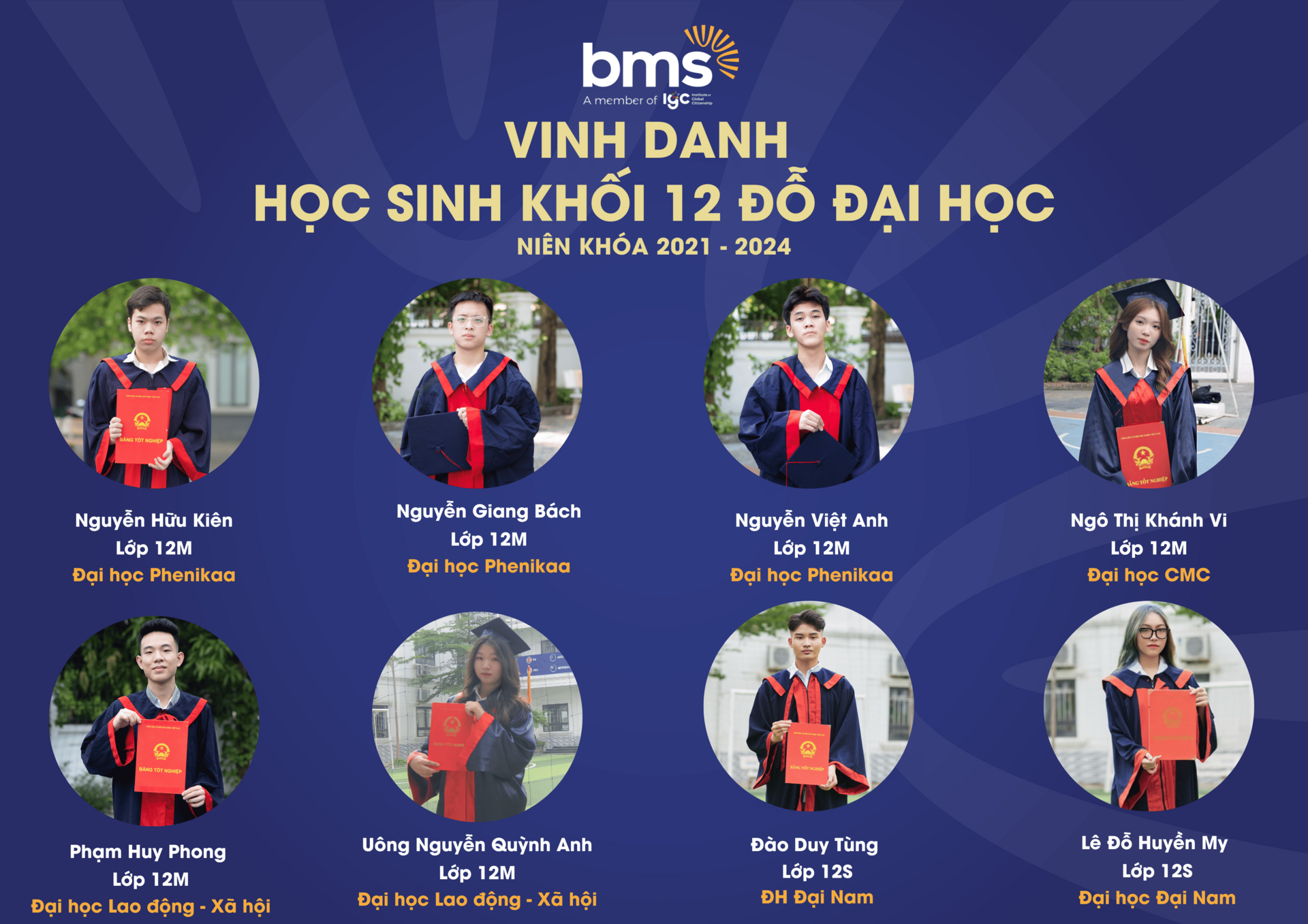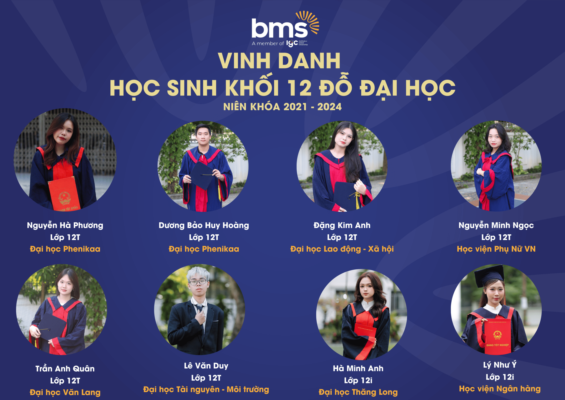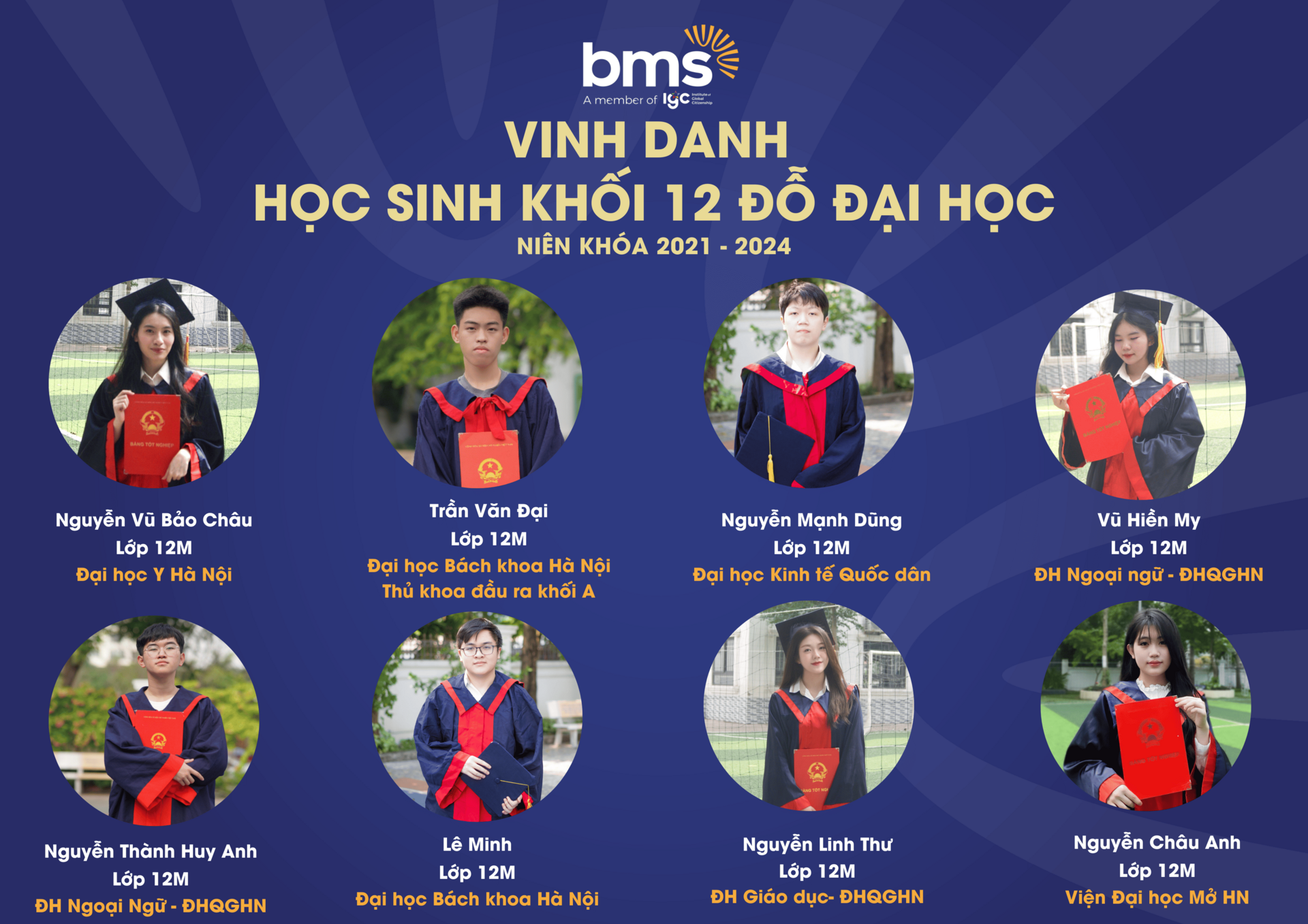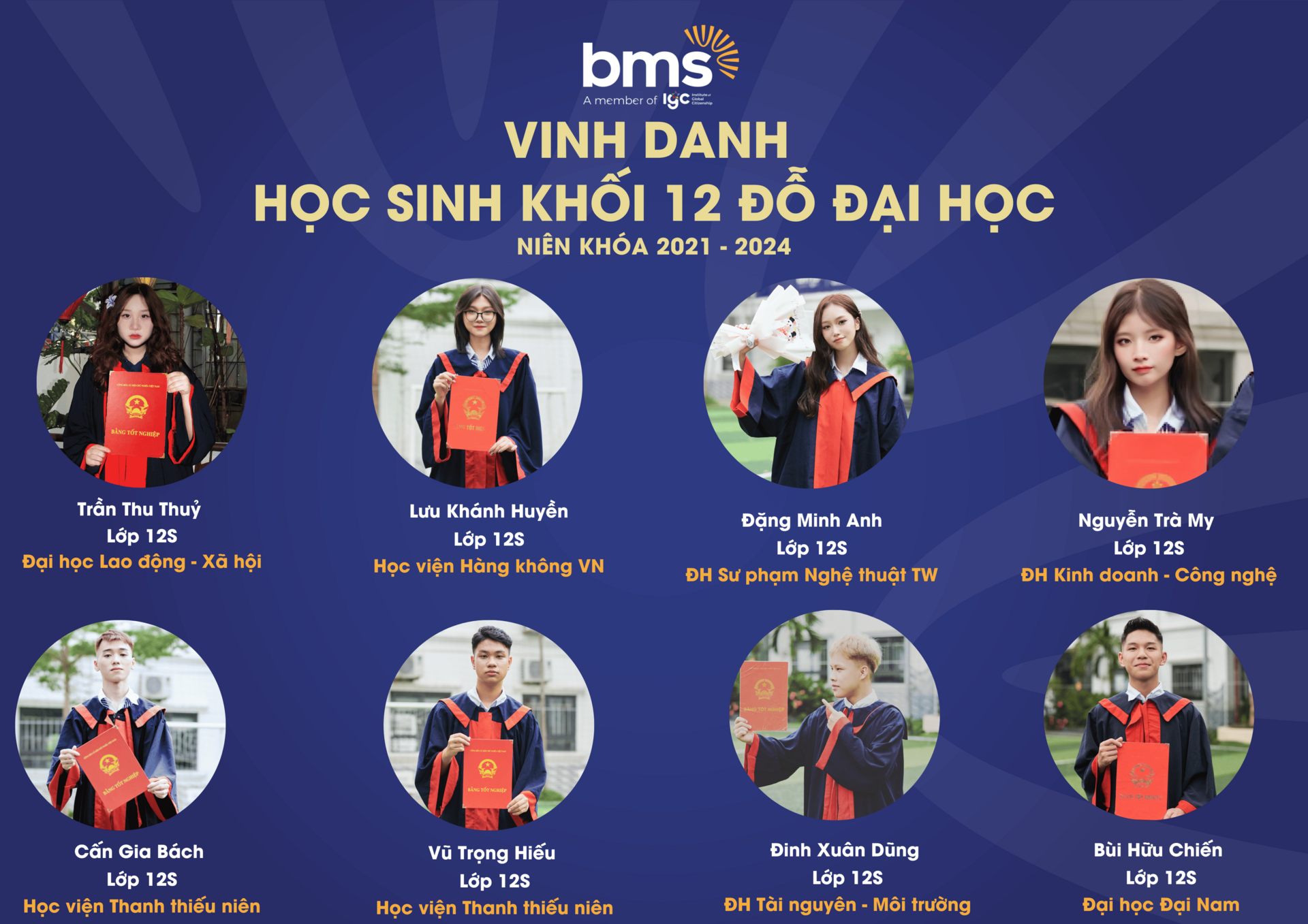 Thầy cô tự hào vinh danh thành tích xuất sắc của 100% học sinh Khối 12 (niên khóa 2021 – 2024) đã gặt hái những trái ngọt mang tên “Đỗ Đại học” trên hành trình giáo dục đầy khát vọng và kiên định của BMS.Với sự đồng hành tận tâm từ đội ngũ giáo viên, cùng phương pháp giảng dạy hiện đại, kết hợp giữa kiến thức và kỹ năng thực tiễn, BMS đã tạo nên một môi trường học tập - nơi mỗi học sinh được khơi dậy đam mê và định hướng tương lai. Thành tích 100% học sinh đỗ tốt nghiệp THPT và chinh phục bảng vàng Đại học là minh chứng cho chất lượng giáo dục vượt trội mà BMS mang đến cho mỗi thế hệ học sinh.
