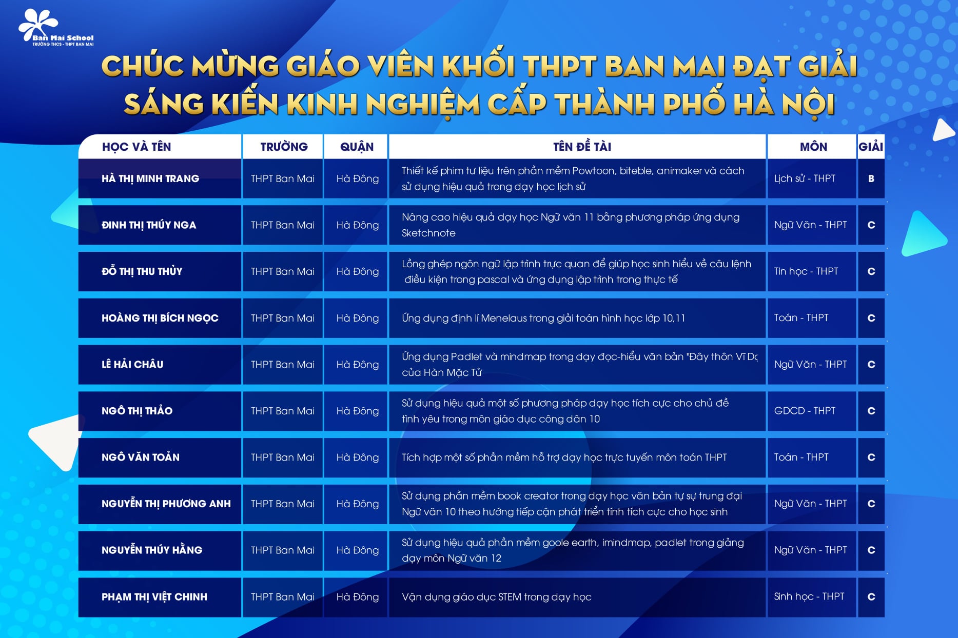 Chắc chắn các thầy cô Ban Mai luôn tiếp cận với điều mới mẻ, thử nghiệm phương pháp dạy hiện đại sẽ là những chìa khóa mở ra những bài học hay, cùng học sinh chinh phục con đường tri thức rộng dài phía trước.