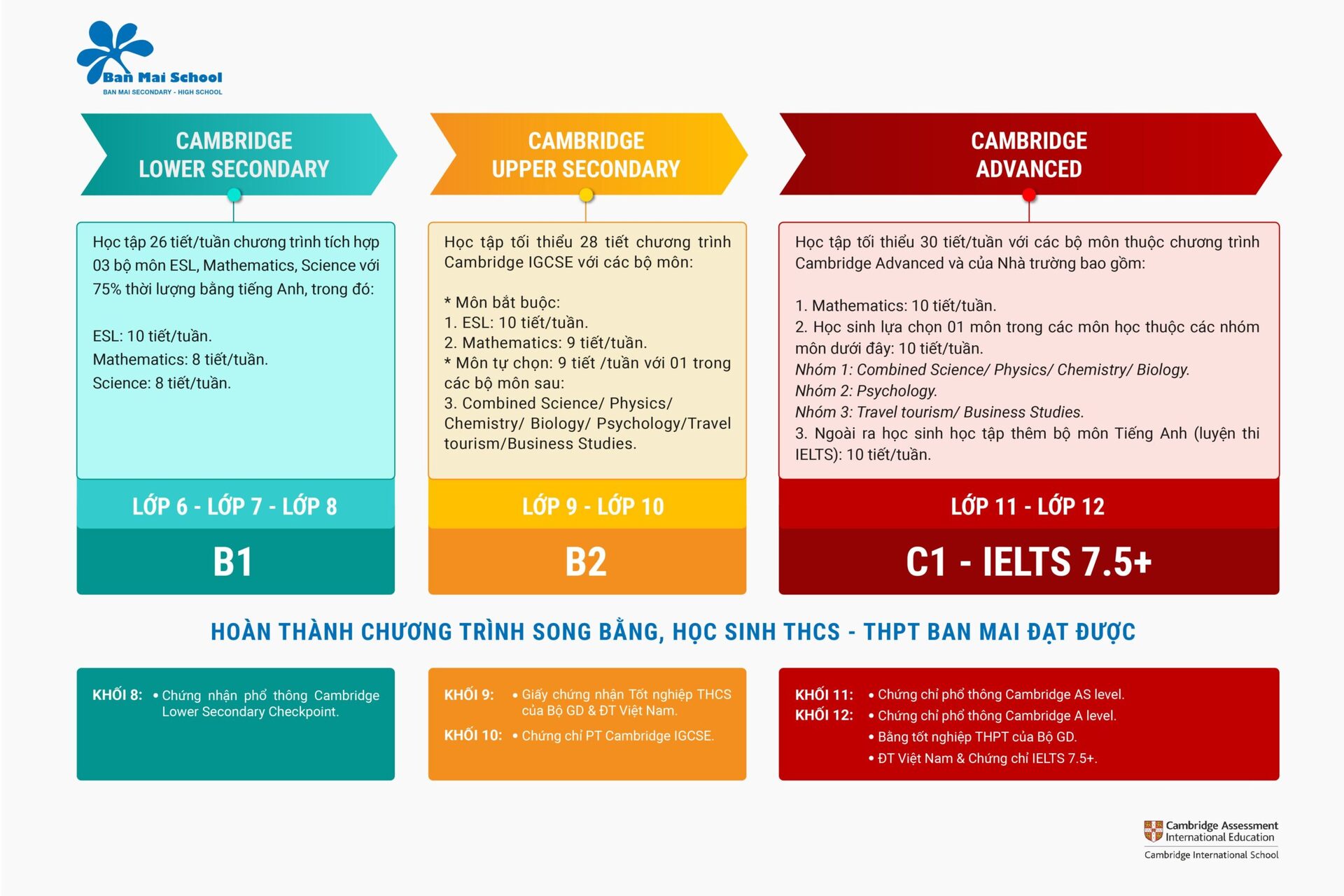 Trường THCS-THPT Ban Mai thiết kế và thực hiện chương trình Quốc tế Cambridge theo một lộ trình học tập xuyên suốt 7 năm học từ cấp THCS lên cấp THPT.