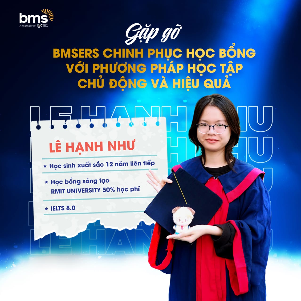 Trong suốt hành trình học tập kéo dài hơn 12 năm tại BMS, từ những ngày đầu cấp Mầm non đến bây giờ, mình đã trải qua nhiều kỳ thi và rất nhiều kỷ niệm vui buồn đều có, mình rất biết ơn các Thầy cô và bạn bè đã góp phần tạo nên mái nhà BMS nuôi dưỡng mình trưởng thành, để bây giờ mình tiếp tục bay xa, bay cao hơn nữa.