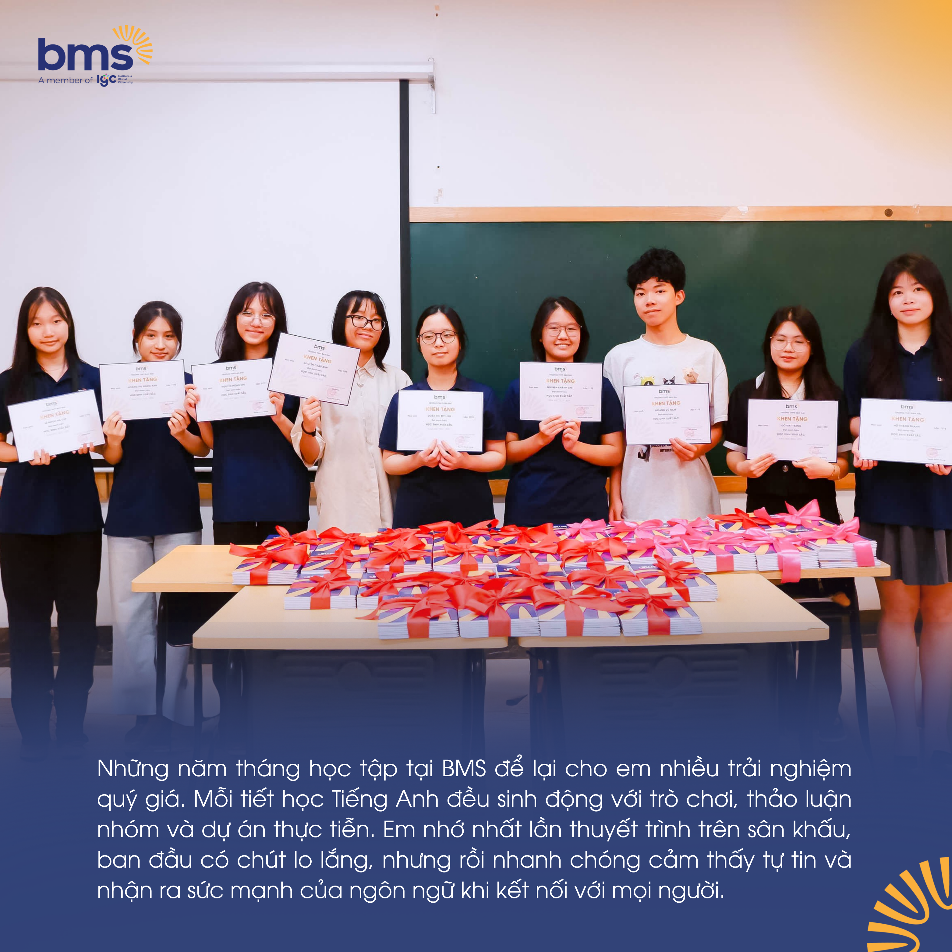 Trong hành trình đi đến những cột mốc mới, Hồng Nhi luôn nhắc đến BMS như mảnh đất khởi đầu. Ở đây, mỗi tiết học tiếng Anh được thầy cô thiết kế sinh động, kết hợp trò chơi, làm việc nhóm và các dự án gắn với thực tiễn. Kiến thức vì thế không dừng ở sách vở mà trở thành công cụ để học sinh bày tỏ suy nghĩ và gắn với cuộc sống.