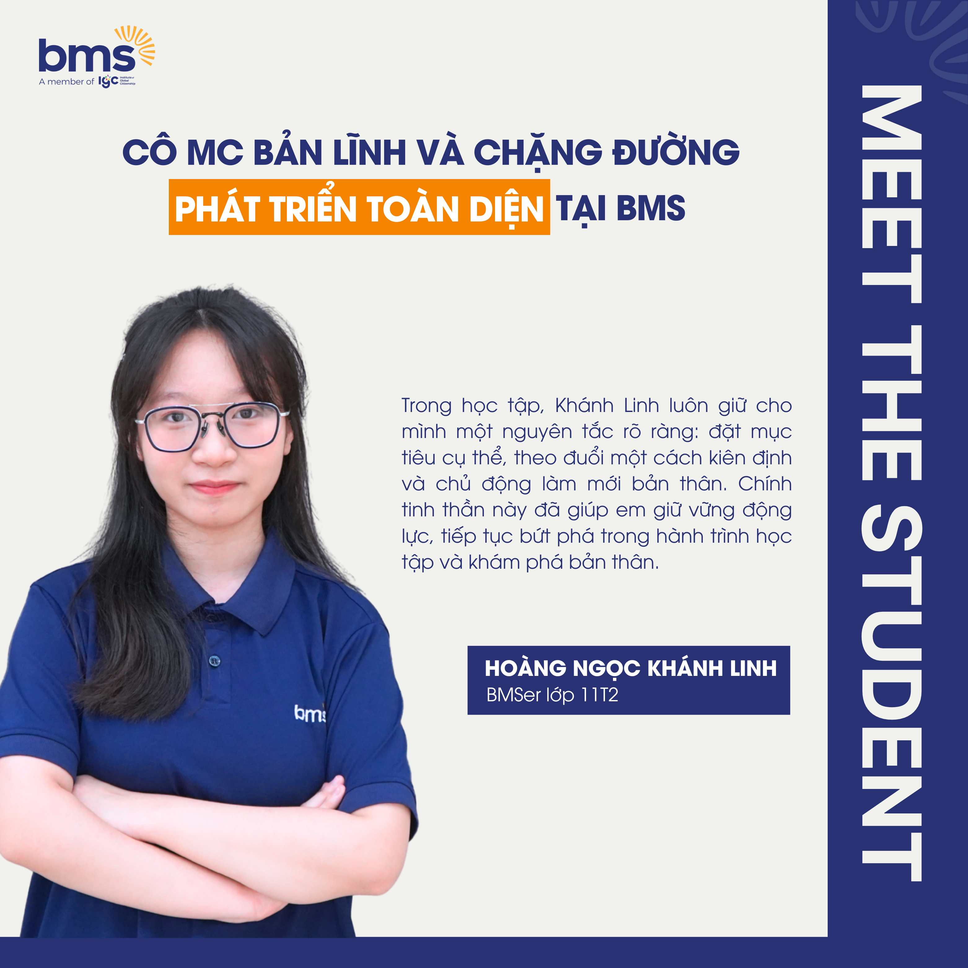 Đi cùng với sự trưởng thành trong học tập, Khánh Linh từng bước khẳng định bản thân qua các hoạt động ngoại khóa tại BMS. Em là một trong những MC năng động, tự tin dẫn dắt nhiều sự kiện lớn nhỏ của trường như Hòa ca, Hội chợ Tết, Lễ tri ân và trưởng thành… Mỗi lần đứng trên sân khấu là một cơ hội để Khánh Linh rèn luyện kỹ năng thuyết trình, học cách xử lý tình huống và dần vượt qua cảm giác lo lắng khi nói trước đám đông. “Tất cả những lần được cầm mic tại trường đều giúp mình học được cách làm chủ sân khấu, tự tin thể hiện suy nghĩ. Hơn cả những dòng ghi chú hoạt động trên “profile”, mình nhìn thấy rõ giá trị của bản thân và có thêm động lực để bước về hành trình phía trước.”