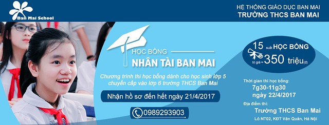Nhằm thu hút nhiều hơn nữa những tài năng và tạo cơ hội cho các con được học tập và phát huy khả năng vượt trội của mình, trường THCS Ban Mai – Hệ thống Giáo dục Ban Mai tổ chức chương trình học bổng nhân tài năm học 2017 – 2018. Chương trình dành cho học sinh lớp 5 tại cách trường Tiểu học trên toàn Quốc: