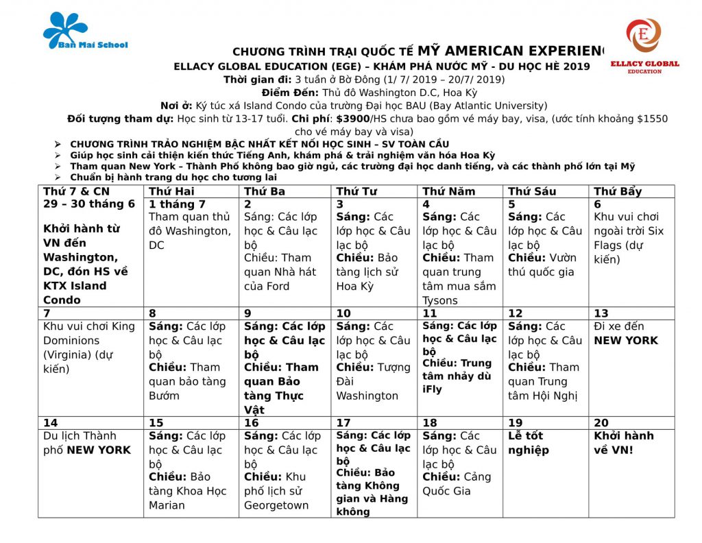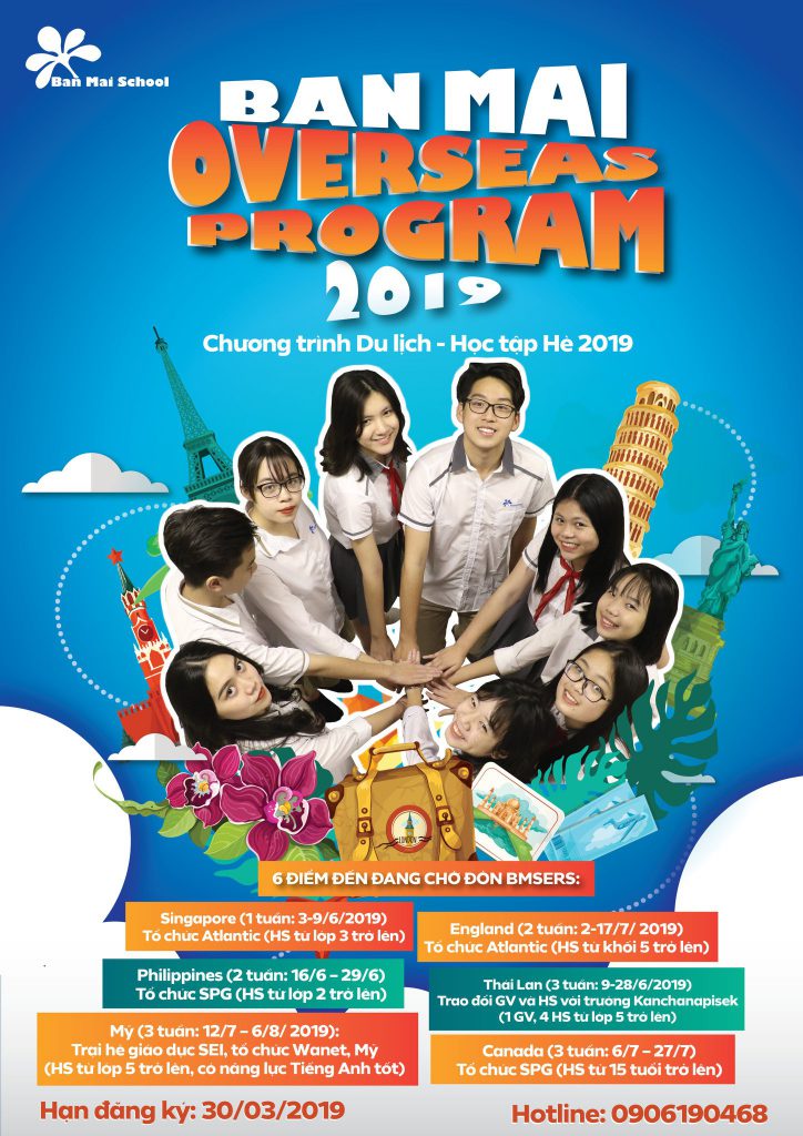 Để mở rộng cơ hội học tập, trải nghiệm cho nhiều đối tượng học sinh Ban Mai hè 2019, nhà trường xây dựng chương trình Hè Quốc tế đa dạng, đồng bộ với nhiều chương trình học tập trải nghiệm, thú vị và hiệu quả. Chương trình là cơ hội để các em nâng cao trình độ ngoại ngữ, mở rộng tầm nhìn, trau dồi kỹ năng sống, làm quen với các nền giáo dục tiên tiến thế giới, hòa nhập vào môi trường toàn cầu và chuẩn bị cho hành trang du học, vào đời trong thời đại công nghệ 4.0.