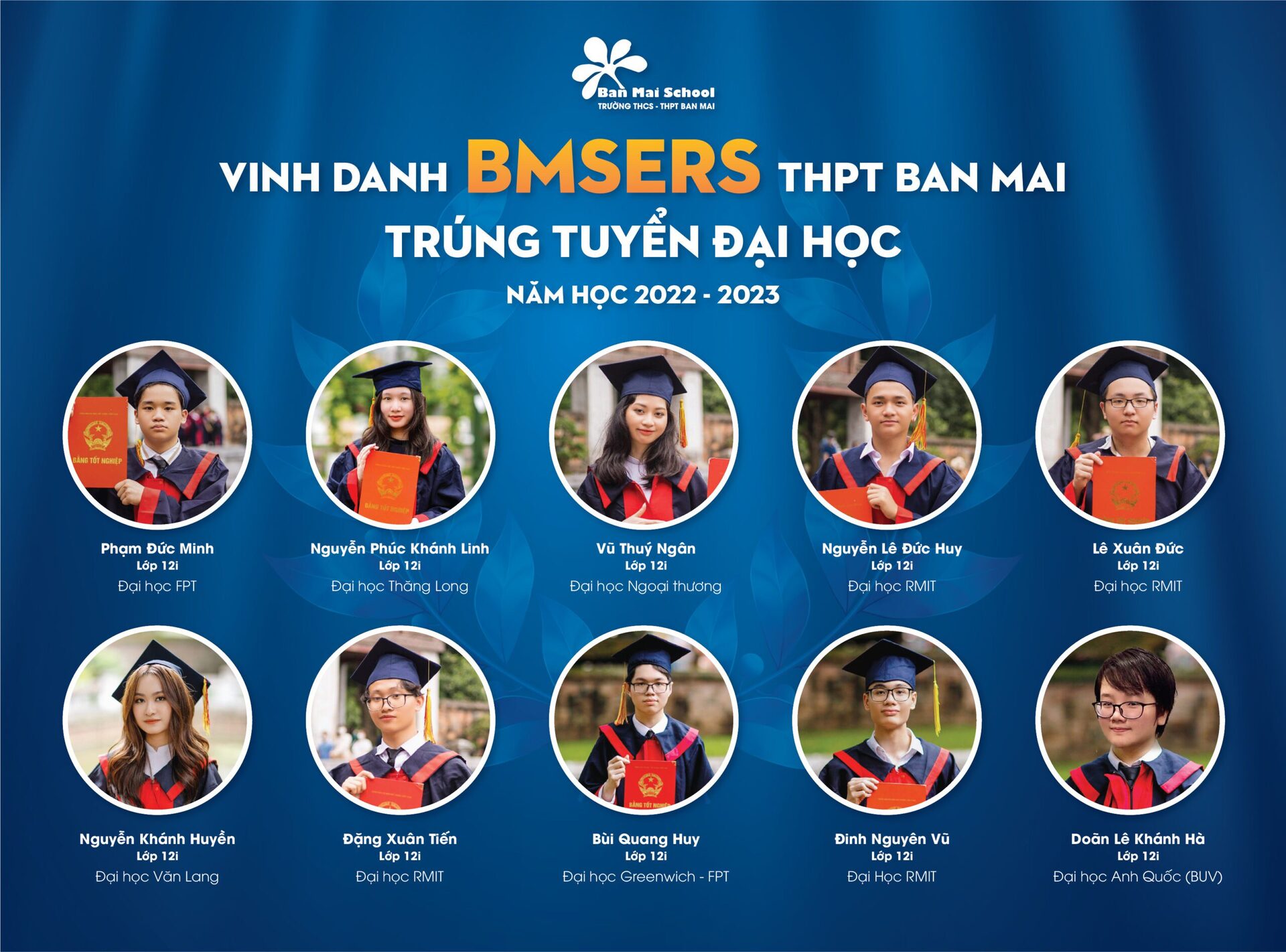 Năm học 2021 – 2022 của Trường THPT Ban Mai (Hà Đông) ghi dấu những thành tích đáng tự hào của Thầy và trò Nhà trường. Bên cạnh các huy chương, các giải thưởng học sinh giỏi các cấp trong nước và Quốc tế, Thầy cô chúc mừng và vinh danh các BMSers đạt thành tích cao: 100% học sinh đỗ tốt nghiệp THPT, 100% học sinh đỗ vào các trường ĐH, Cao đẳng và định hướng nghề. BMSers đã xuất sắc ghi danh vào các trường ĐH hàng đầu tại Việt Nam, trong đó có thể kể tới: ĐH Quốc gia Hà Nội, ĐH Bách Khoa, ĐH Ngoại Thương, ĐH Kinh tế Quốc dân, ĐH Hà Nội, ĐH Sư phạm, Học viện Ngân hàng,…