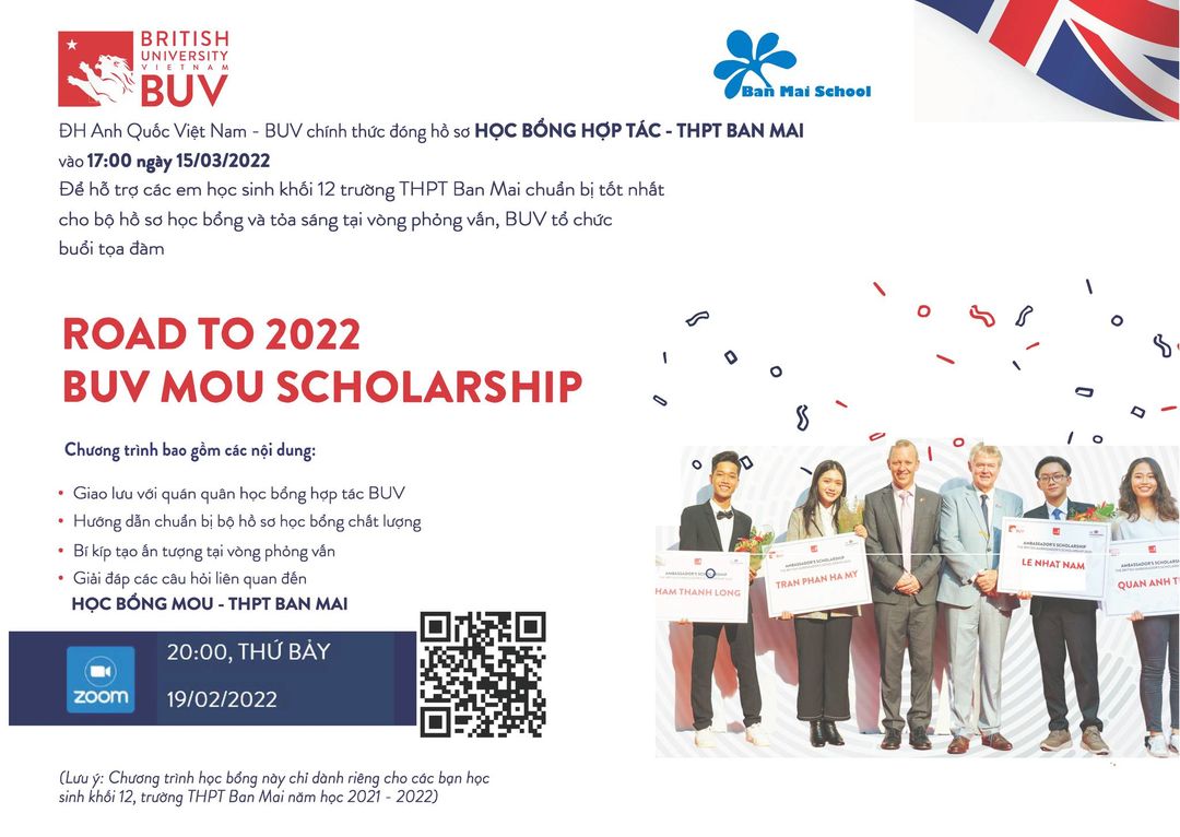Trường Đại Học Anh Quốc Việt Nam (BUV) trân trọng thông báo: Để hỗ trợ các em học sinh lớp 12 có cơ hội tiếp cận và hoàn chỉnh hồ sơ ứng tuyển cho Quỹ Học bổng Hợp tác BUV – THPT Ban Mai năm 2022, bao gồm các suất học bổng trị giá 30% và 40% học phí cho toàn bộ chương trình Cử nhân, BUV tổ chức chương trình Tọa đàm trực tuyến “ROAD TO 2022 BUV MOU SCHOLARSHIP” với các thông tin cụ thể như sau: