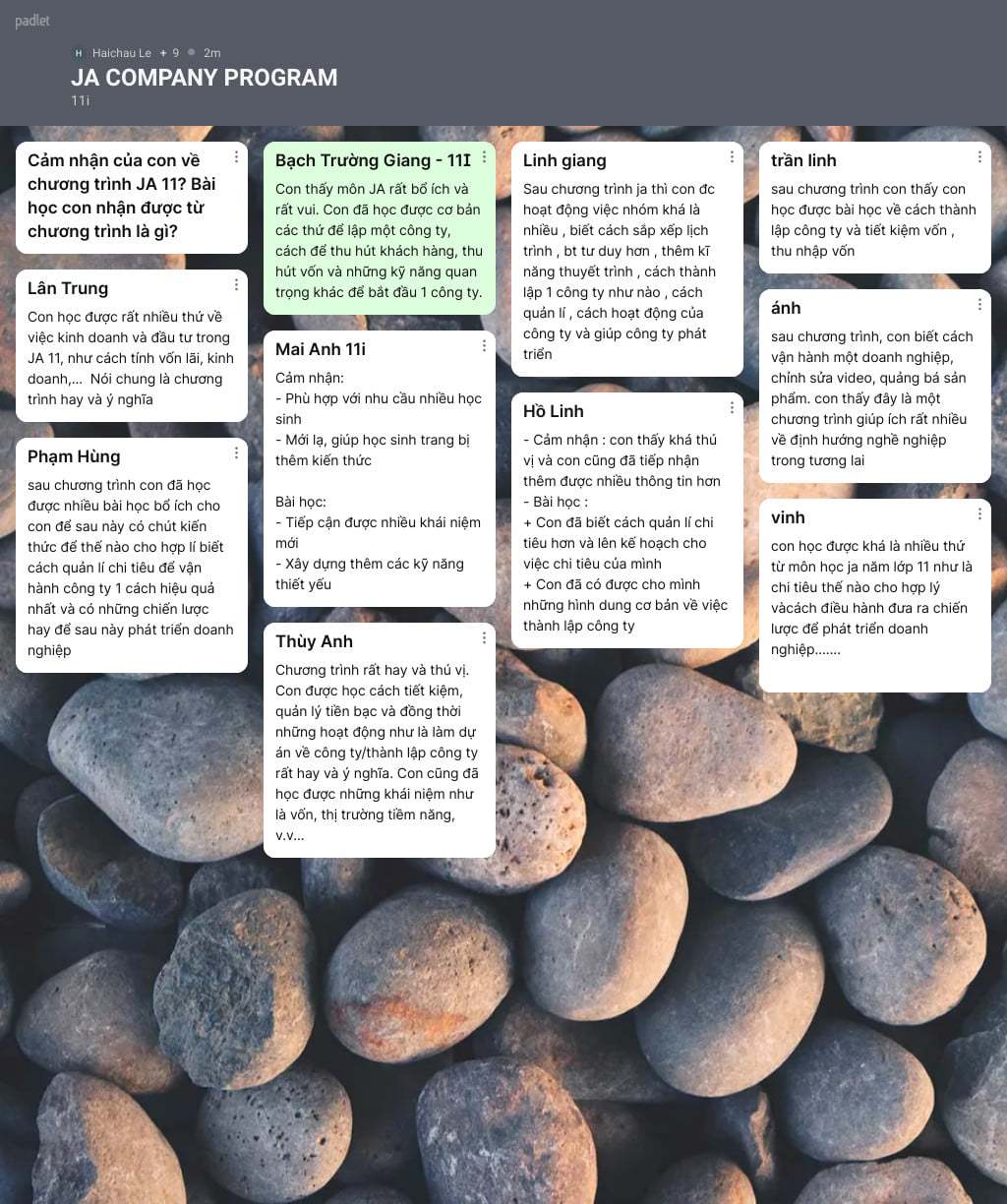 Với sự dẫn dắt của cô giáo Lê Hải Châu, nhóm dự án của các lớp 11i, 11T, 11A không chỉ đưa ra các ý tưởng dự án kinh doanh, khởi nghiệp sáng tạo, mà còn thể hiện tinh thần làm việc theo đội nhóm, khả năng xử lý tình huống, các kỹ năng cứng và mềm được phát huy tối đa trong các dự án.
