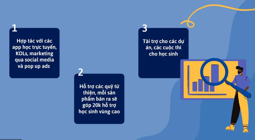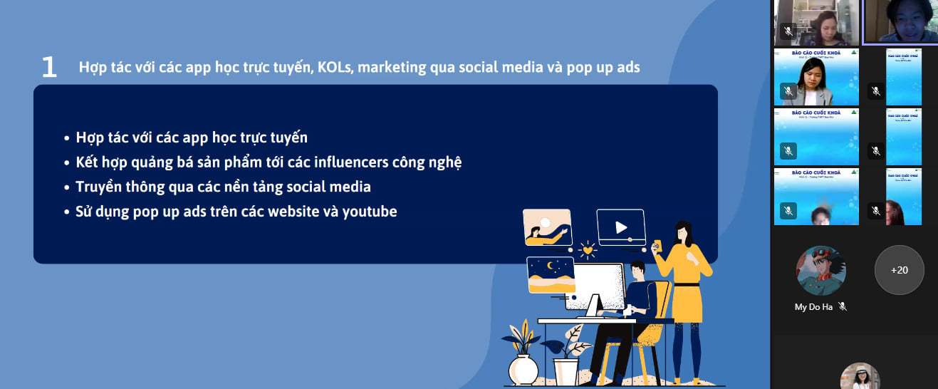 Sau 12 chủ đề của trình JA Company Program, các nhóm dự án đã có buổi báo cáo học tập cuối khoá với phương pháp thuyết trình dự án: phân tích thị trường, tìm hiểu khách hàng tiềm năng, thiết kế bộ nhận diện thương hiệu, lập mô hình kinh doanh, chiến lược quảng bá sản phẩm, cách thức huy động vốn…