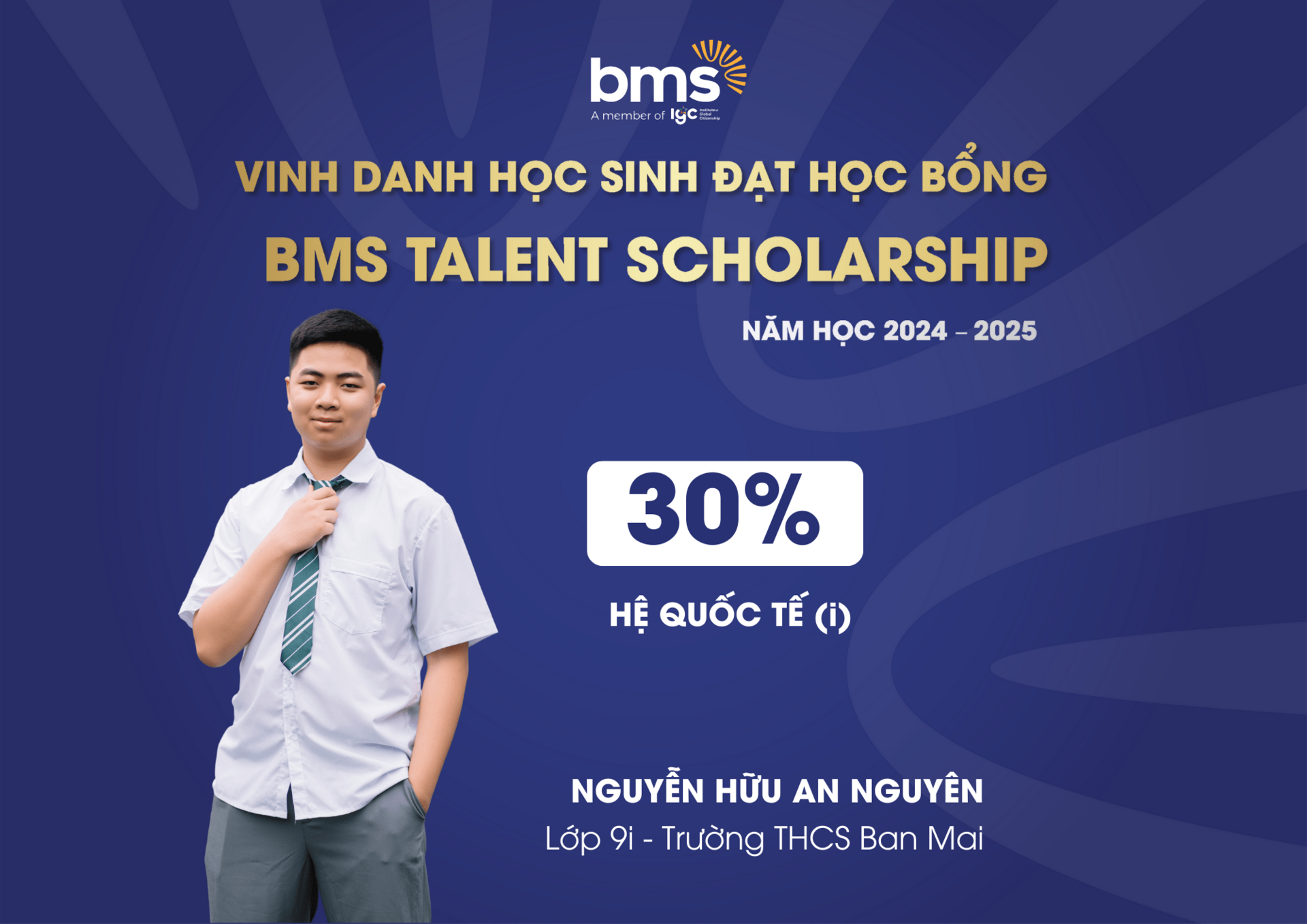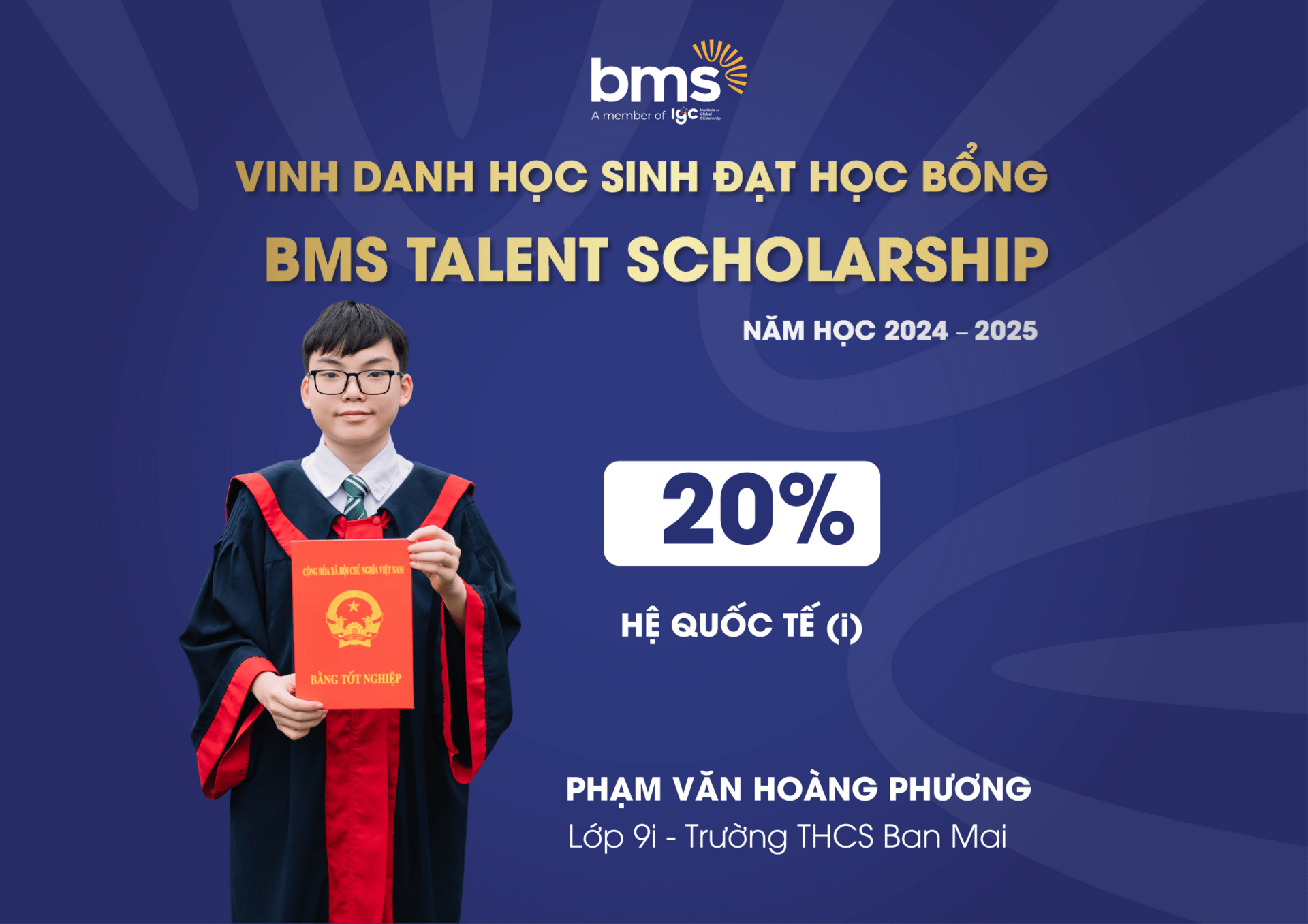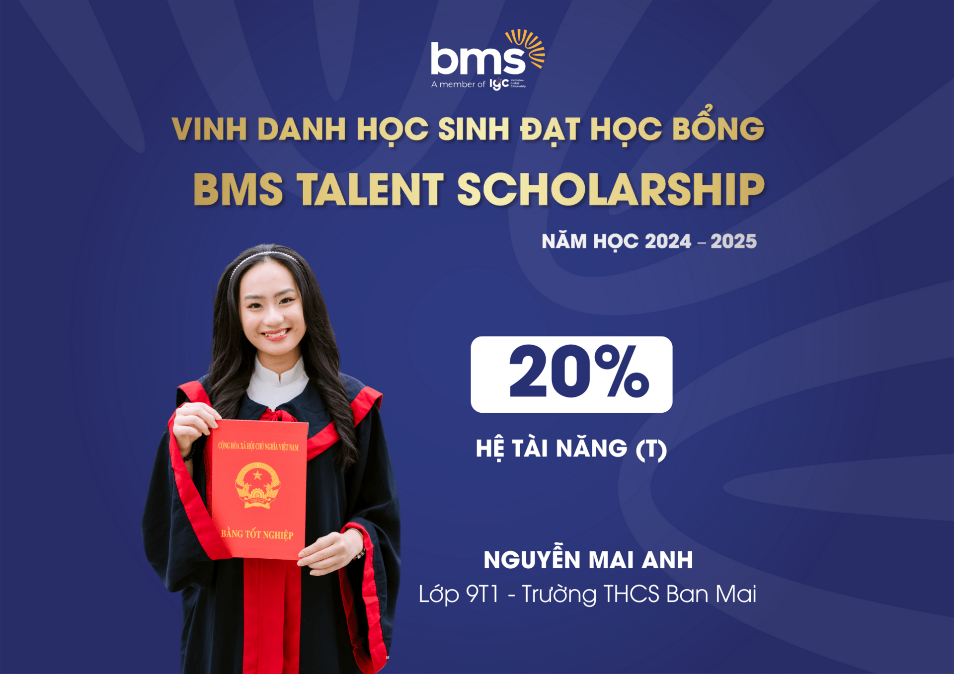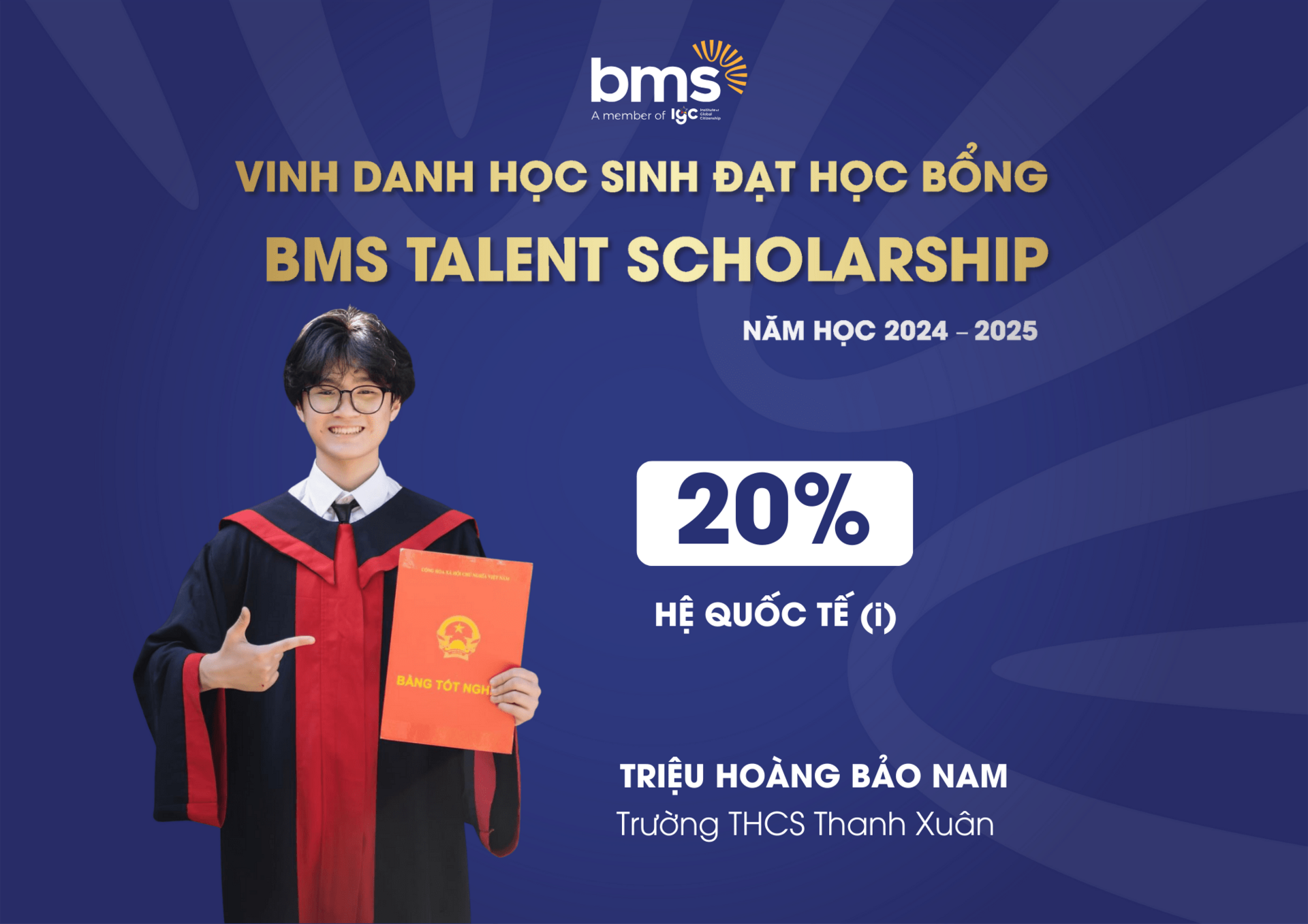 Đây là học bổng danh giá, tôn vinh những học sinh đạt thành tích cao ở các cuộc thi về học thuật, năng khiếu, đồng thời tạo cơ hội cho các bạn được học tập, phát triển khả năng vượt trội của mình trong môi trường giáo dục tại BMS.