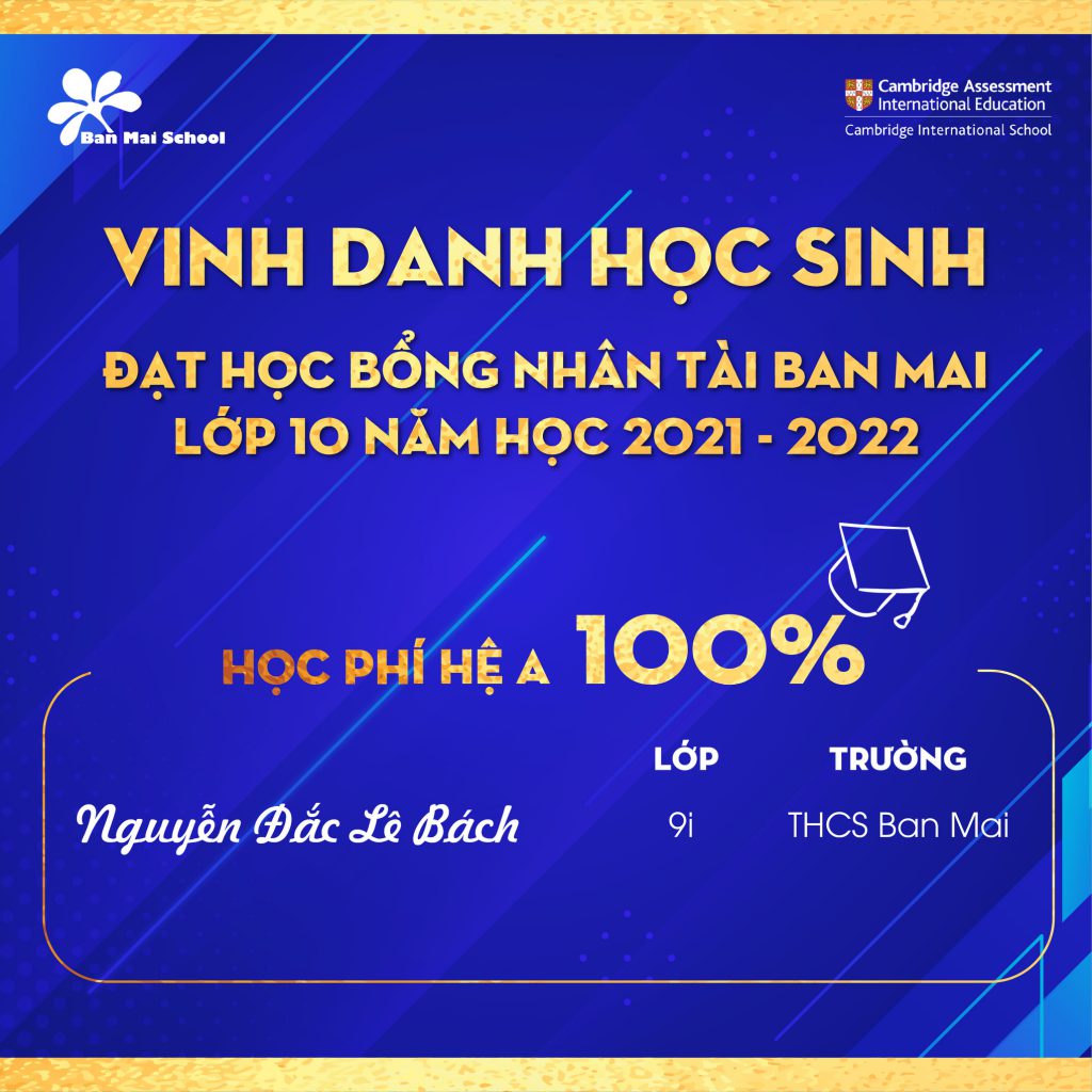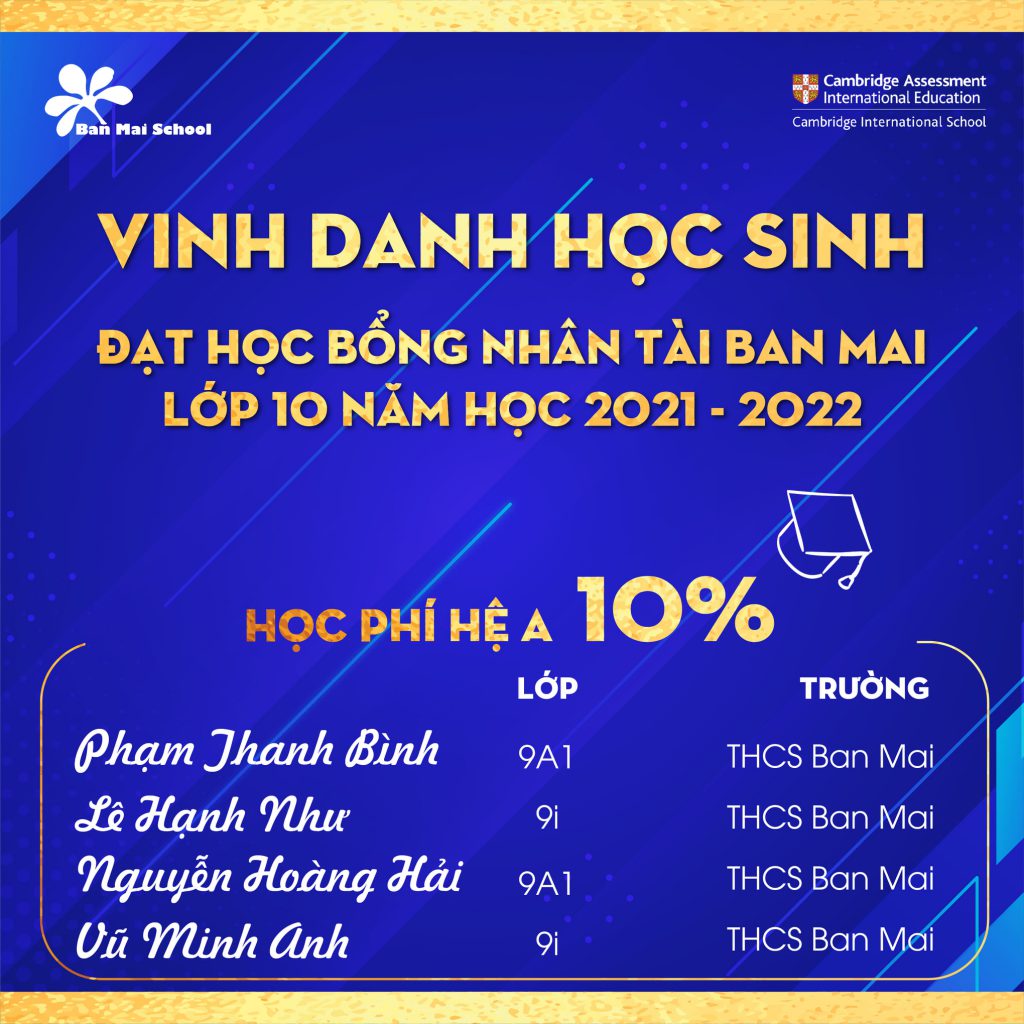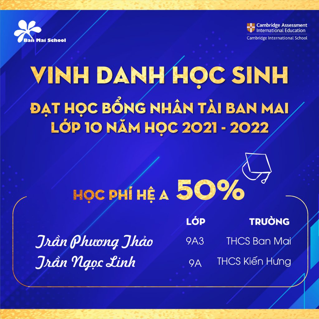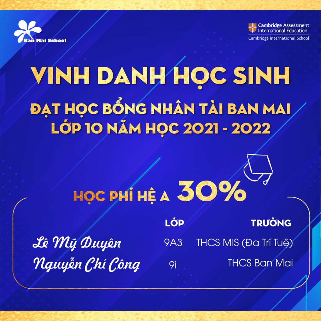 Trường THCS – THPT Ban Mai chúc mừng 15 học sinh đã xuất sắc chinh phục kỳ thi HỌC BỔNG NHÂN TÀI BAN MAI năm học 2021 -2022. Đây là một dấu mốc quan trọng ghi nhận năng lực và sự nỗ lực vượt bậc của các con học sinh.