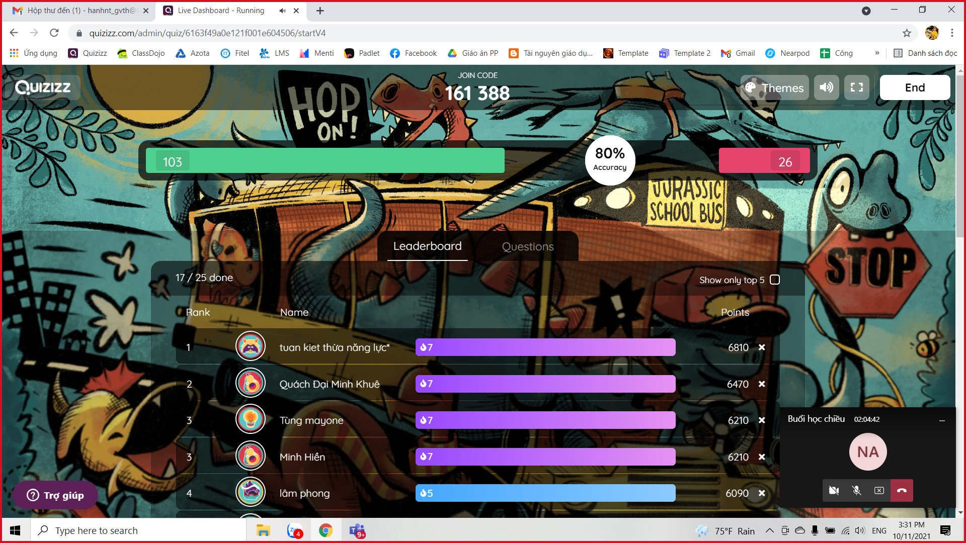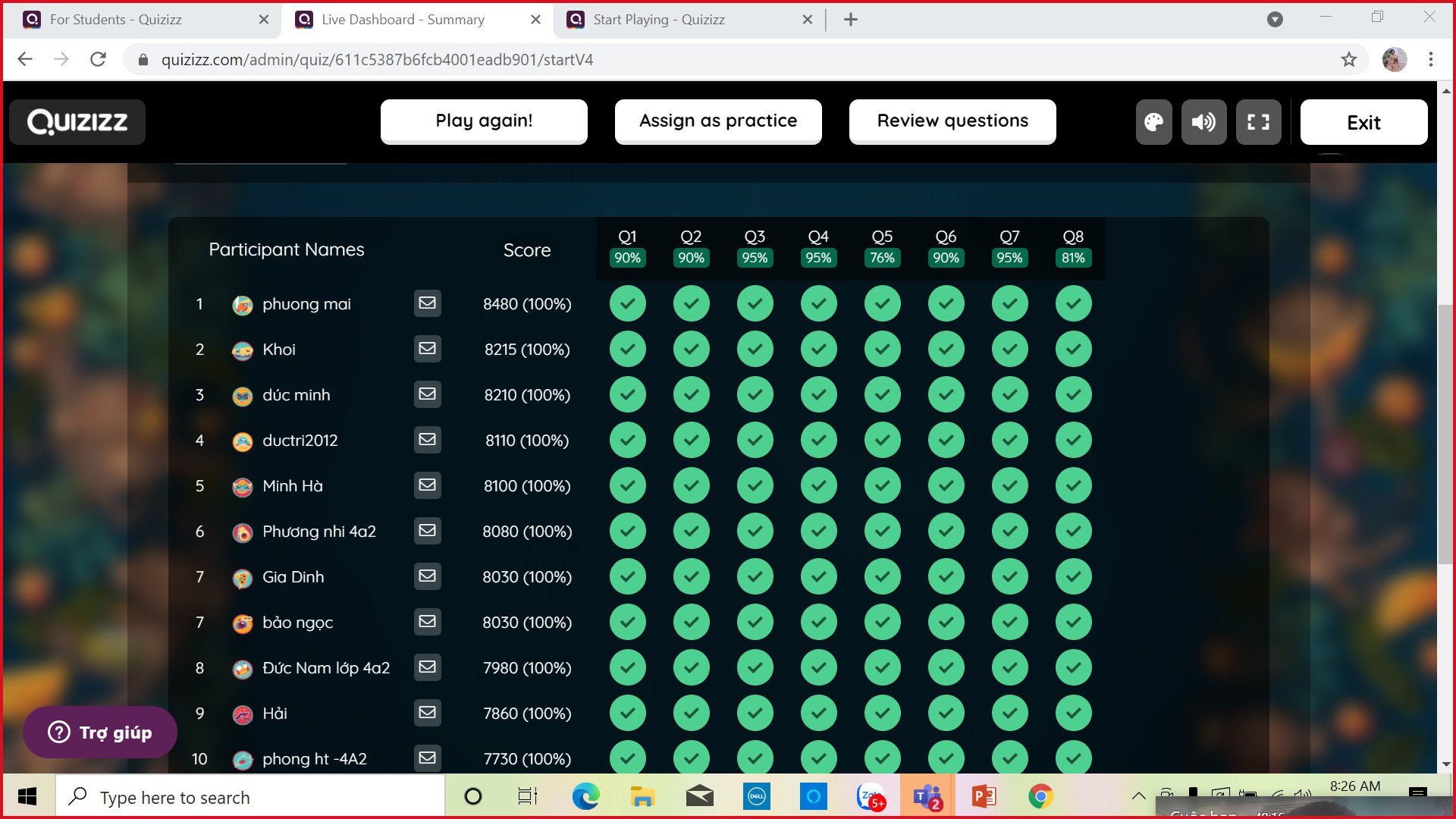 Con thích chơi quizizz nhất mặc dù Blooket mới nhưng con vẫn ủng hộ quizizz. Con thích âm nhạc trên quizizz và con thích thu đua với các bạn. Không những thế con còn được chữa bài sau khi chơi.