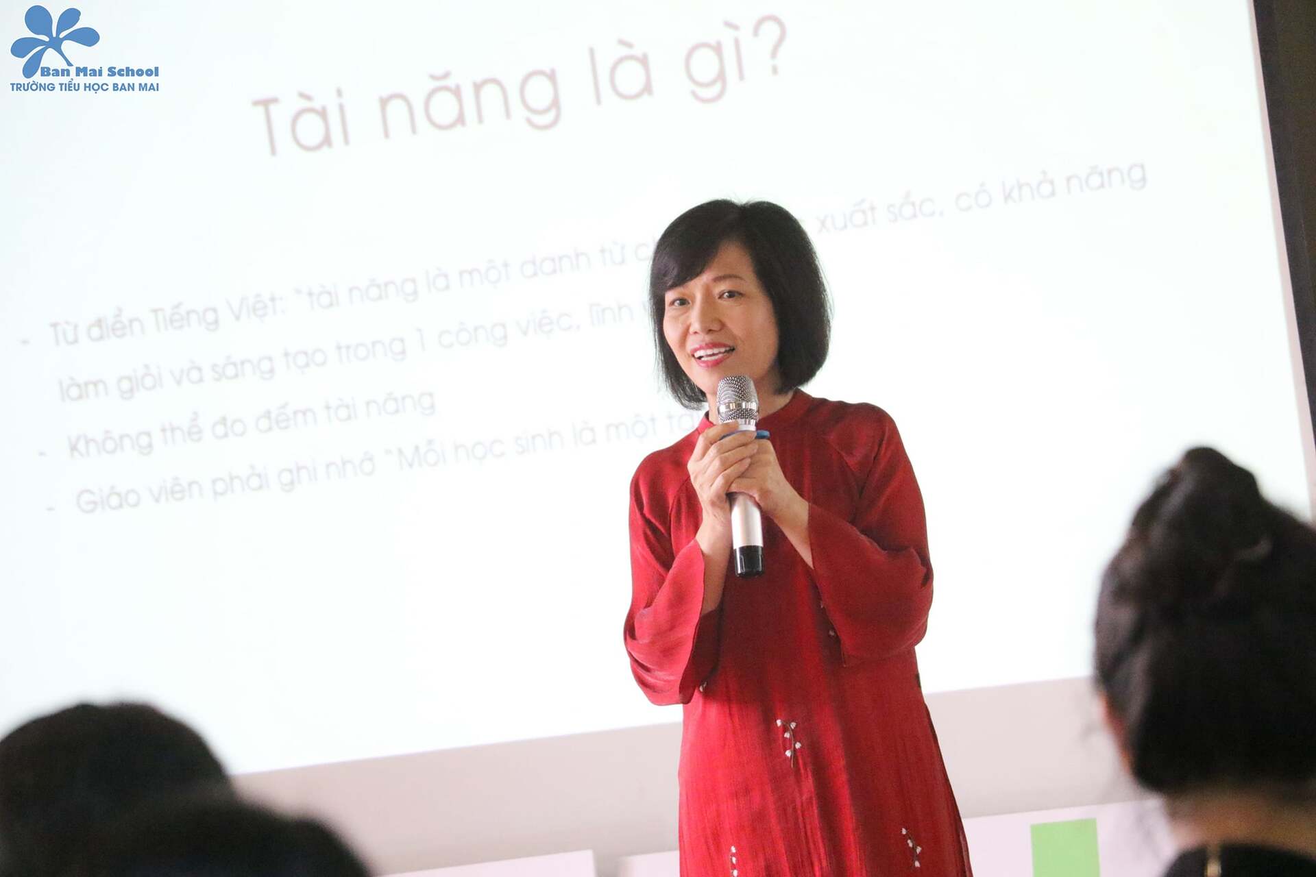 Đồng thời diễn ra cùng khoảng thời gian các con làm bài thi, là Hội thảo “Đánh thức tố chất thiên tài trong con” dành cho các cha mẹ, diễn ra tại Hội trường K1 nhà trường, với phần chia sẻ của cô Mai Thị Lan Anh – Nhà sáng lập Ban Mai school, và cô Nguyễn Thị Thanh Nương – Hiệu trưởng nhà trường.
