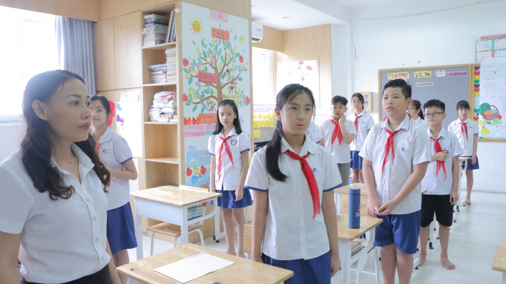 Để đảm bảo an toàn cho học sinh, trường không tổ chức lễ chào cờ tập trung mà cho các lớp thực hiện ngay trong phòng học.