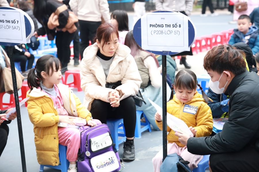 Ngay từ sớm, các bạn nhỏ cùng Cha Mẹ đã có mặt tại trường để chuẩn bị cho một ngày quan trọng. Không khí tại trường rộn ràng và náo nhiệt hơn bao giờ hết với sự hiện diện của hàng trăm “sĩ tử nhí” đầy hào hứng và tự tin. Sự háo hức, bỡ ngỡ hiện rõ trên khuôn mặt các con khi lần đầu tiên tham gia một kỳ thi đặc biệt.