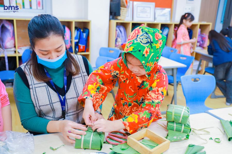 Cô trò BMS cùng nhau gói những chiếc bánh chưng xinh xắn