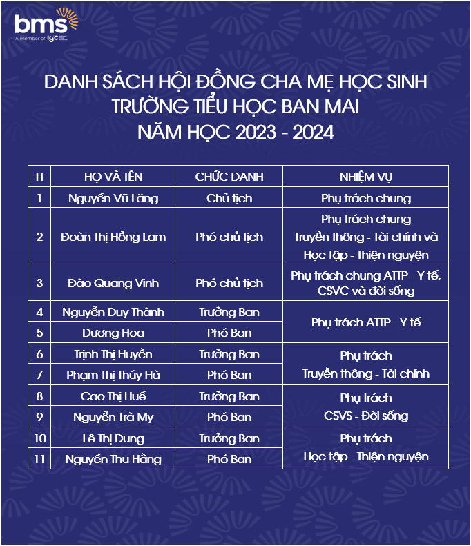 Căn cứ theo kết quả buổi họp thành lập Hội đồng Cha mẹ Học sinh Trường Tiểu học Ban Mai (HĐCMHS) ngày 27/10/2023, Hội đồng Cha mẹ Học sinh Trường Tiểu học Ban Mai được bầu cử gồm 11 thành viên, lựa chọn từ các khối trong trường (mỗi khối 2 đại diện, Khối jumpee 1 đại diện).