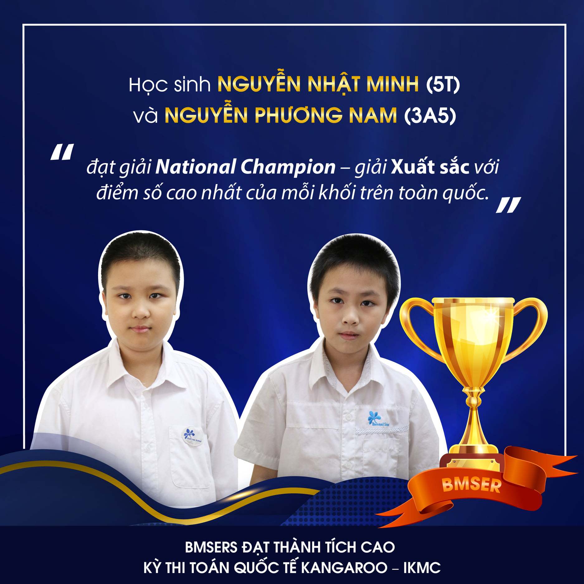 Kỳ thi Toán Quốc tế Kangaroo:– 2 giải National Champion- 1 giải High Distinction- 2 giải Distinction- 4 giải Top 5%- 8 giải Top 10%Đặc biệt, bạn Nguyễn Nhật Minh lớp 5T và bạn Nguyễn Phương Nam lớp 3A5 là hai bạn đạt giải National Champion – giải xuất sắc với điểm số cao nhất của mỗi khối trên toàn quốc.