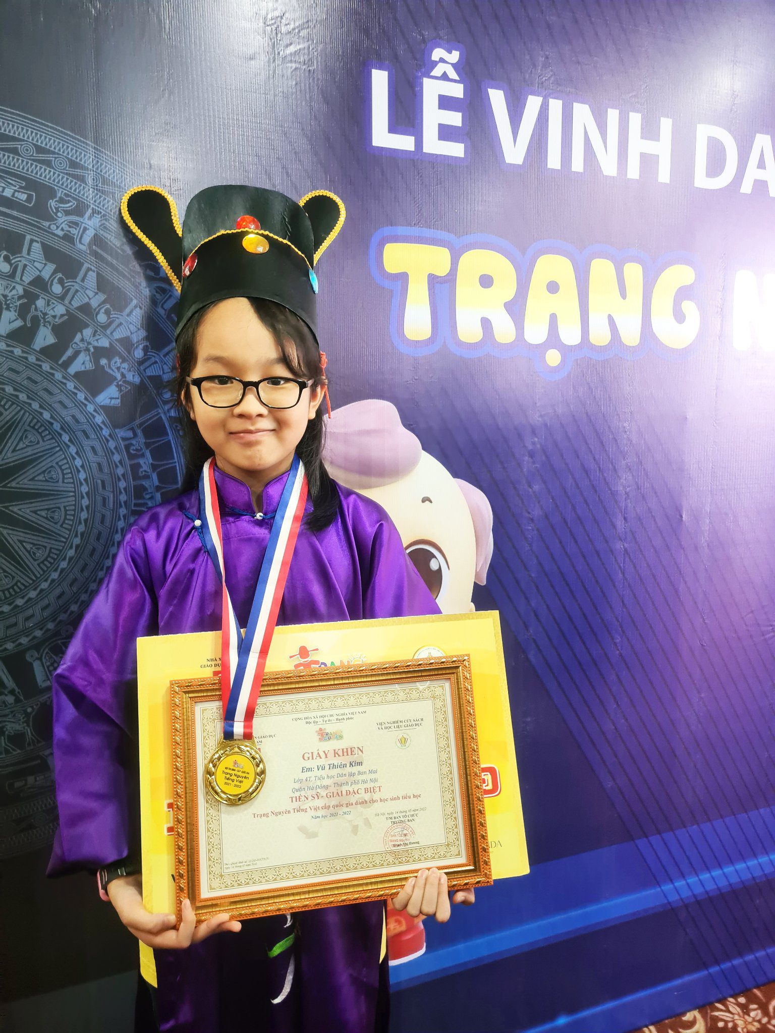 Vượt qua hơn 1 triệu thí sinh, Vũ Thiên Kim – Học sinh lớp 4T trường Tiểu học Ban Mai trở thành 1 trong 309 sĩ tử xuất sắc nhất đến từ 44 tỉnh thành trên cả nước được tranh tài tại Hội thi Đình – Trạng Nguyên Tiếng Việt cấp Quốc gia năm 2022. Và Thiên Kim đã xuất sắc trở thành Tiến sĩ trong cuộc thi .