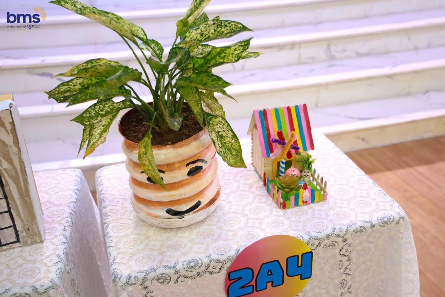 Từ những vật liệu tưởng chừng như không còn giá trị sử dụng, đôi bàn tay khéo léo và óc sáng tạo của BMSers đã biến chúng thành những sản phẩm tái chế độc đáo. Ngôi nhà cầu vồng rực rỡ từ những que kem, hộp bút xinh xắn, chậu cây xanh mát từ chai nhựa, hay thùng thu gom pin làm từ bìa carton – tất cả đều mang trong mình một thông điệp ý nghĩa: tận dụng, tái chế để giảm thiểu rác thải, bảo vệ hành tinh xanh.