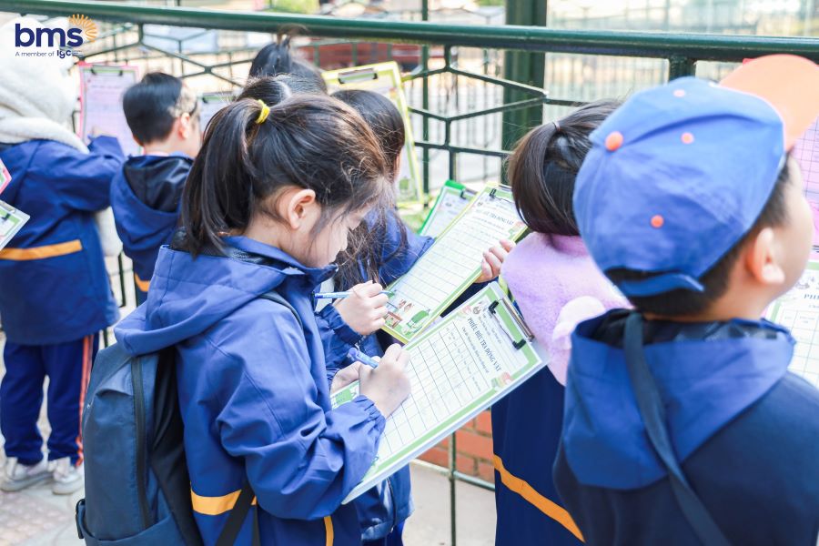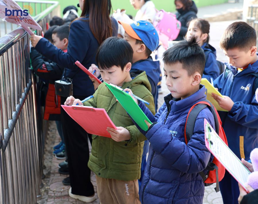 Không dừng lại ở việc quan sát, chuyến đi còn mang đến những hoạt động thực hành và trò chơi bổ ích, giúp các con hiểu sâu hơn về tầm quan trọng của việc bảo vệ động vật. Tay cầm "phiếu điều tra động vật," từng bạn nhỏ chăm chú ghi lại những đặc điểm của các loài mà mình khám phá. Dưới sự hướng dẫn của các cô hướng dẫn viên, BMSers sử dụng kiến thức vừa học được để hoàn thành các thông tin về đặc điểm nổi trội, môi trường sống, thức ăn yêu thích của từng loại động vật.