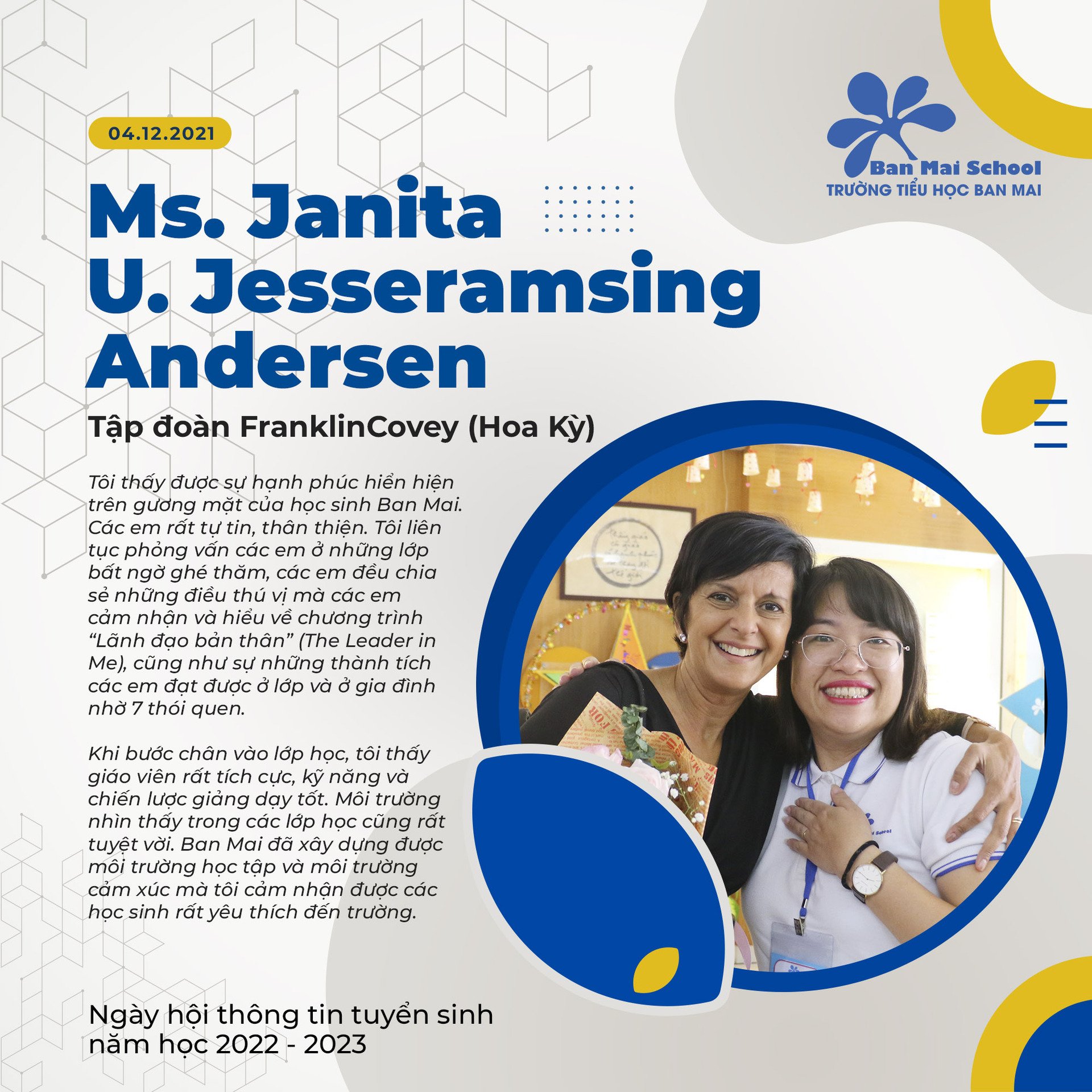 Tôi thấy được sự hạnh phúc hiển hiện trên gương mặt của học sinh Ban Mai. Các em rất tự tin, thân thiện. Tôi liên tục phỏng vấn các em ở những lớp bất ngờ ghé thăm, các em đều chia sẻ những điều thú vị mà các em cảm nhận và hiểu về chương trình “Lãnh đạo bản thân” (The Leader in Me), cũng như sự những thành tích các em đạt được ở lớp và ở gia đình nhờ 7 thói quen.