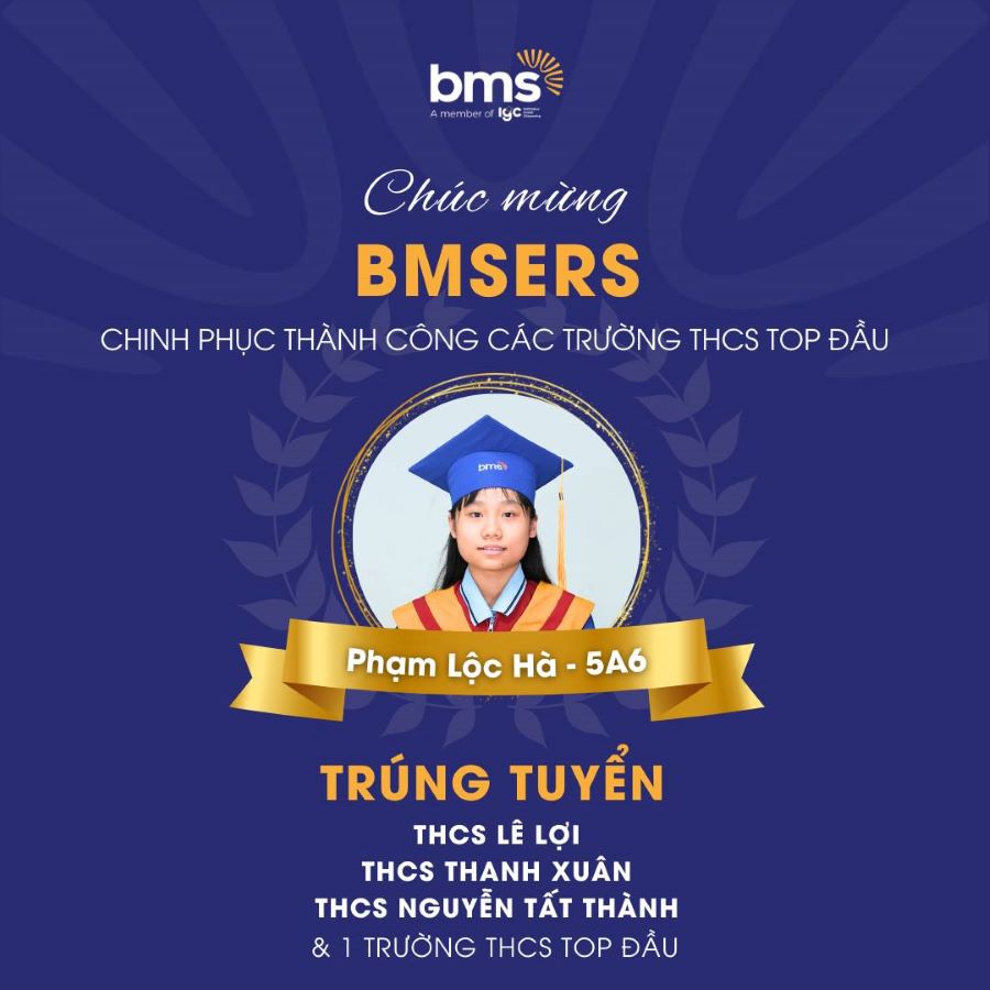 Kỳ thi vào các trường THCS chuyên/chất lượng cao tại Hà Nội luôn là cuộc đua gay cấn với tỉ lệ cạnh tranh vô cùng cao. Dù vậy, với tài năng, sự tự tin và quyết tâm chinh phục thử thách, rất nhiều BMSers đã thành công chinh phục những ngôi trường top đầu: THCS Ngoại Ngữ, THCS Thanh Xuân, THCS Lê Lợi, THCS Nguyễn Tất Thành, Hệ Tài năng THCS Ban Mai...