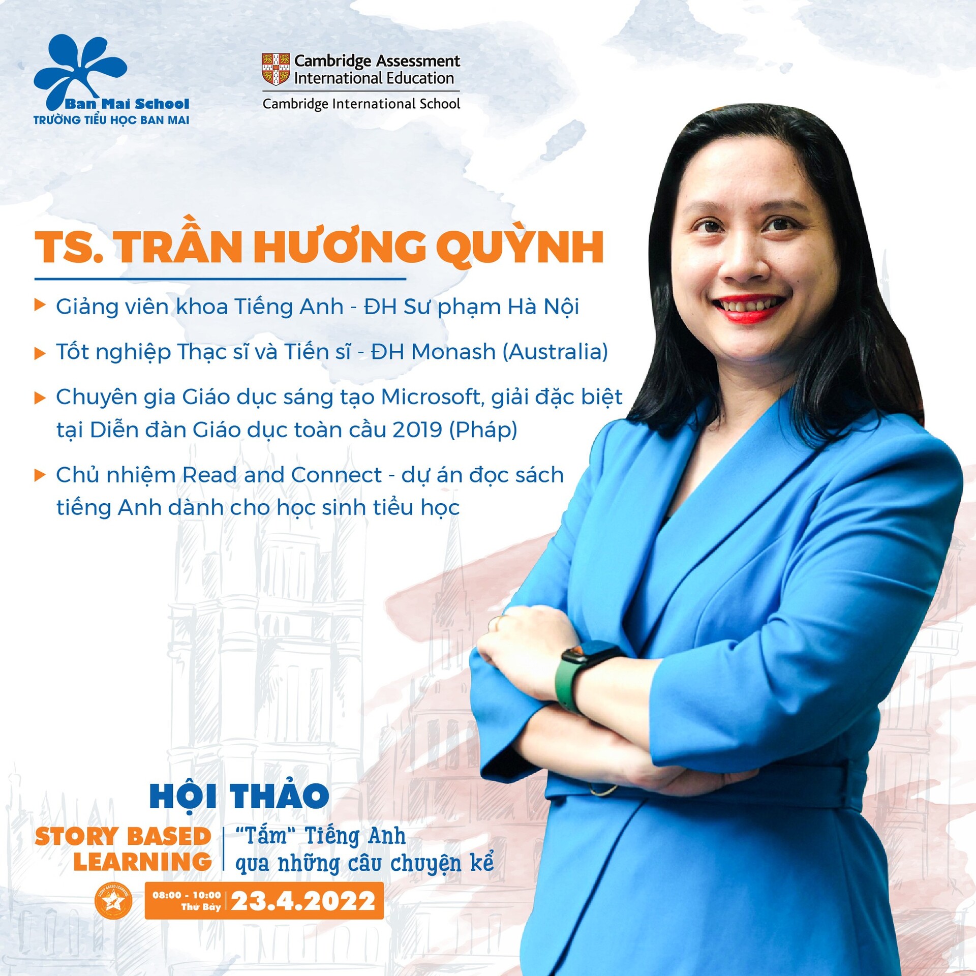 Là diễn giả chính của chương trình HỘI THẢO TUYỂN SINH “STORY BASED LEARNING” (Tắm Tiếng Anh qua những câu chuyện kể) sẽ diễn ra vào sáng Thứ Bảy, ngày 23/4/2022 tại Trường Tiểu học Ban Mai, TS. Hương Quỳnh sẽ bật mí với các bố mẹ về sức mạnh tiềm tàng và giá trị của phương pháp dạy học thông qua kể chuyện.