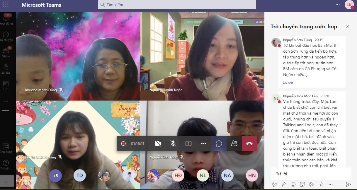 Về Tiếng Anh thì con phản xạ nhanh và rất hứng thú với các buổi học. Một tiến bộ nữa là con thạo công nghệ hơn. Hy vọng thế hệ của các con sẽ vượt trội nhờ tiến độ học tập như hiện nay”.