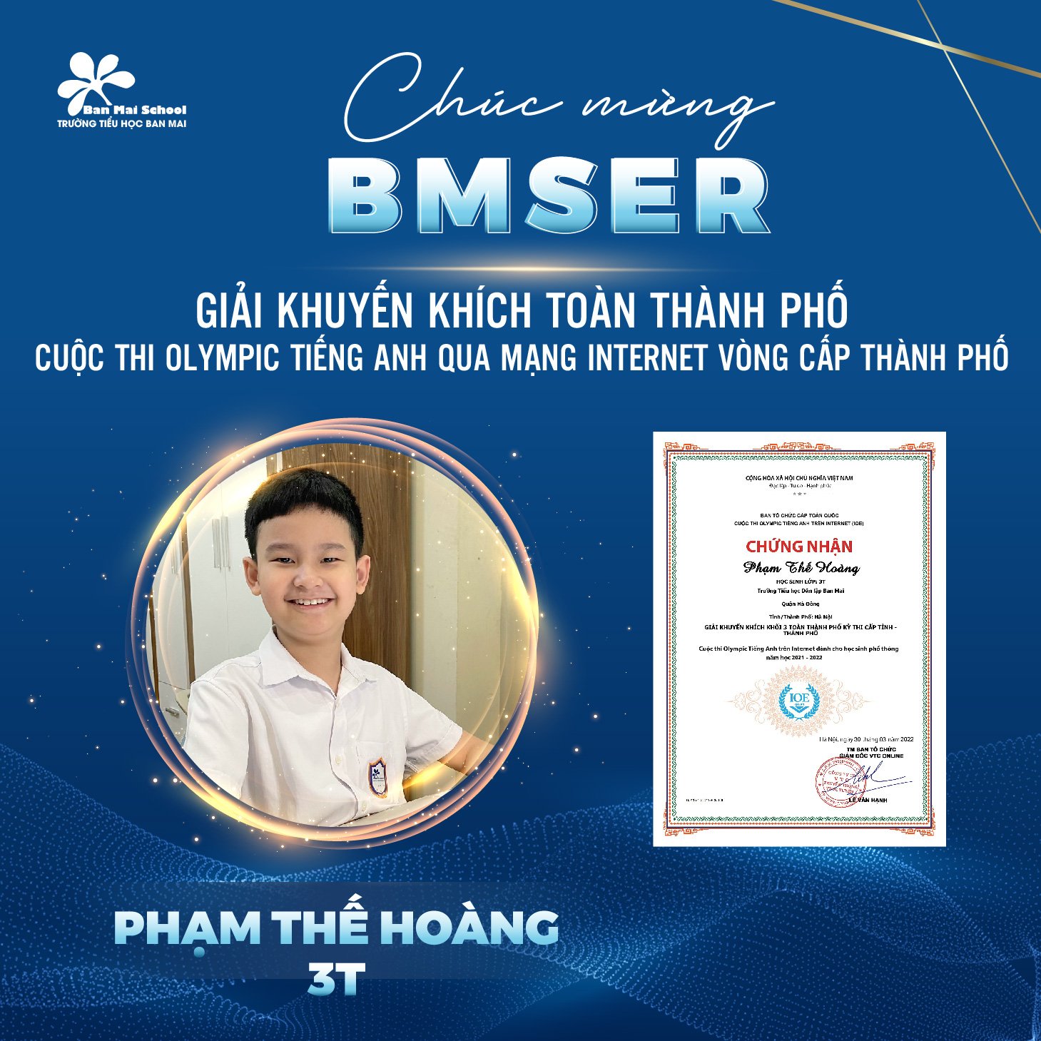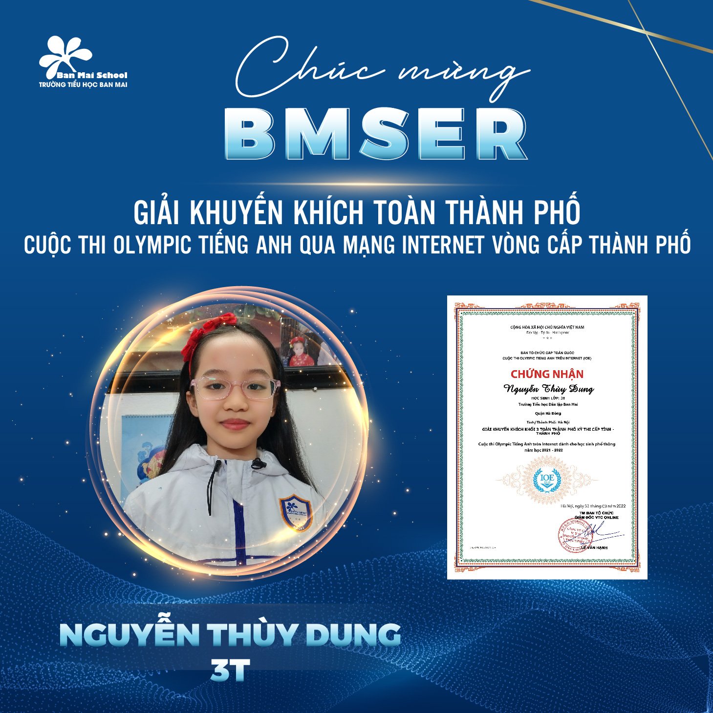 Chúc mừng 5 gương mặt BMSers đã đạt thành tích cao trong kỳ thi Giải Tiếng Anh qua mạng Internet (IOE) cấp Thành phố.
