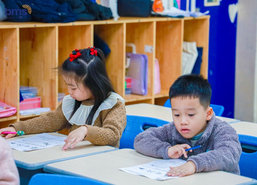 Các bạn nhỏ nghiêm túc ôn tập bộ đề luyện thi được soạn bởi ban chuyên môn BMS