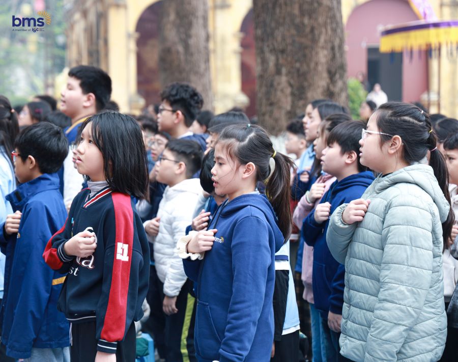 Ngay từ những bước chân đầu tiên vào khu di tích, không khí trang nghiêm và linh thiêng đã bao trùm toàn đoàn. Tại điện Kính Thiên, nơi được xem là trái tim của Hoàng thành, BMSers cùng Thầy cô giáo đã trang trọng thực hiện nghi thức Chào cờ và Nghi lễ dâng hương để tưởng nhớ công ơn của 52 vị Tiên đế tiền triều. Khoảnh khắc ấy không chỉ là lời nhắc nhở các con về công lao dựng nước và giữ nước của cha ông, mà còn gieo vào lòng các con trách nhiệm gìn giữ và phát huy những giá trị cao đẹp mà tổ tiên đã để lại.