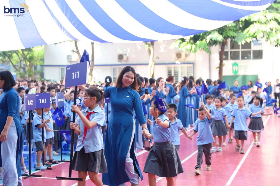 Các em đã tiến hành diễu hành quanh sân trường, thể hiện niềm tự hào khi được khoác lên mình bộ đồng phục học sinh Tiểu học. Sau khi nhận biển lớp từ thầy cô, những BMSers đã chính thức đánh dấu sự khởi đầu của hành trình học tập mới tại BMS.