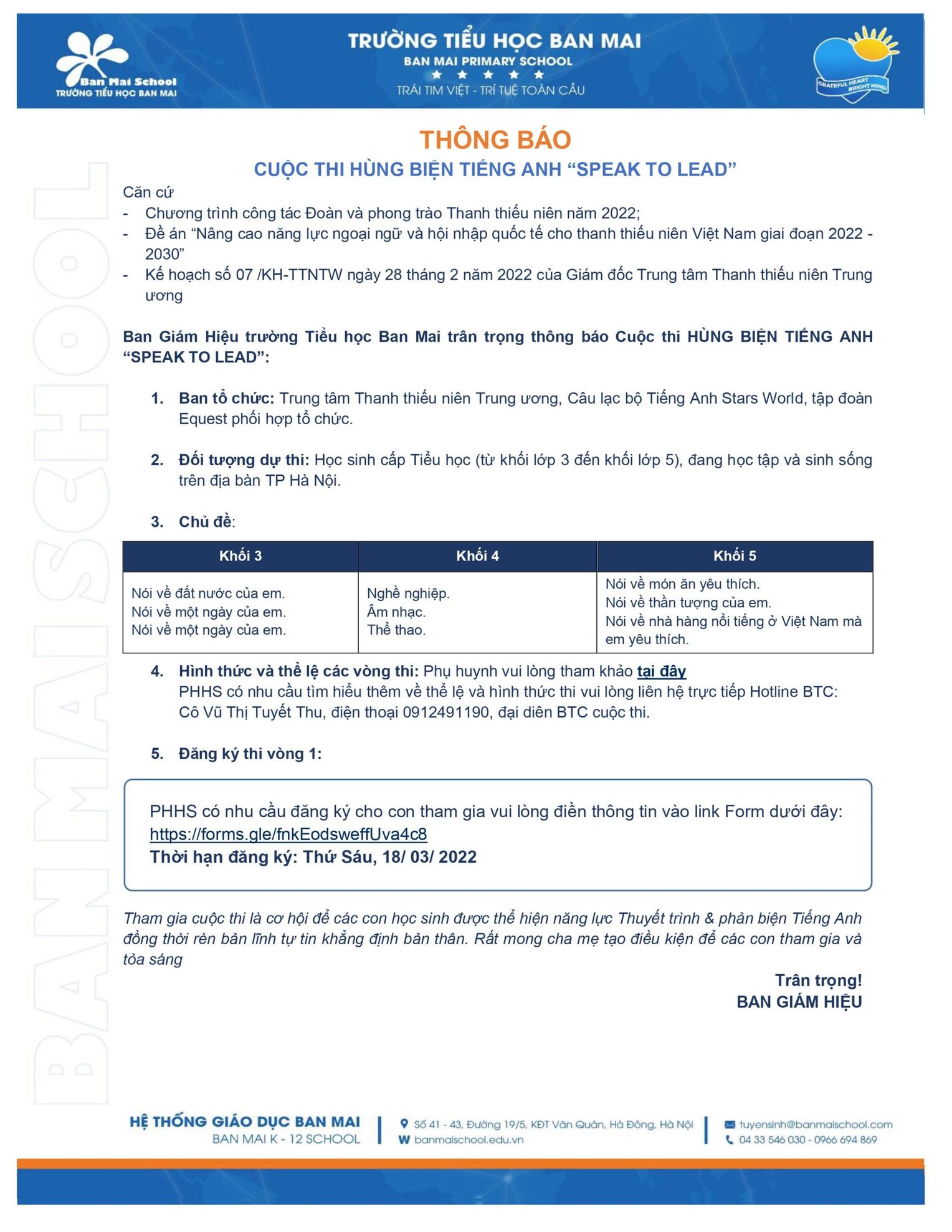 Cuộc thi HÙNG BIỆN TIẾNG ANH “SPEAK TO LEAD” do Trung tâm Thanh thiếu niên Trung ương, Câu lạc bộ Tiếng Anh Stars World, tập đoàn Equest phối hợp tổ chức, dành cho học sinh cấp Tiểu học (từ khối lớp 3 đến khối lớp 5), đang học tập và sinh sống trên địa bàn TP Hà Nội.