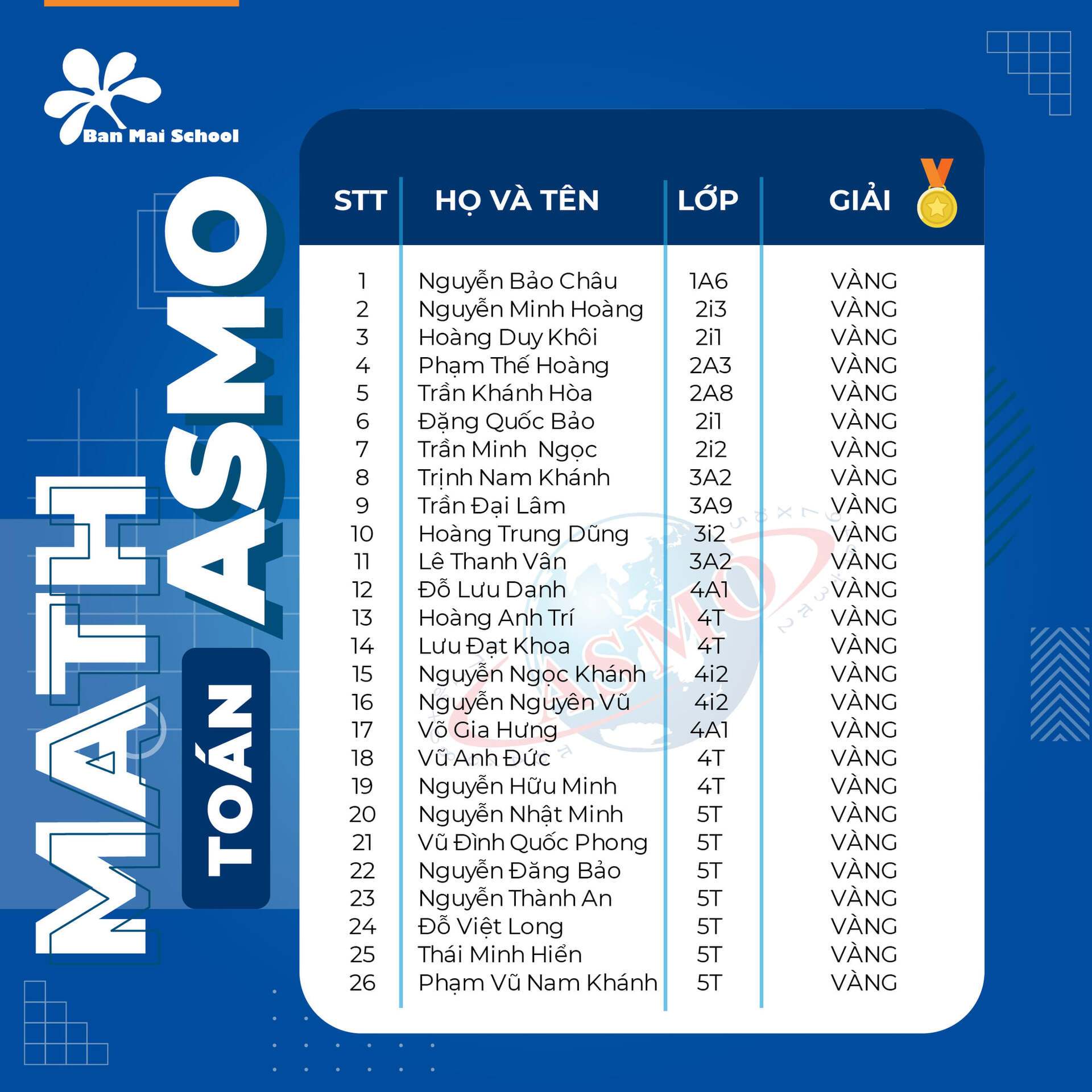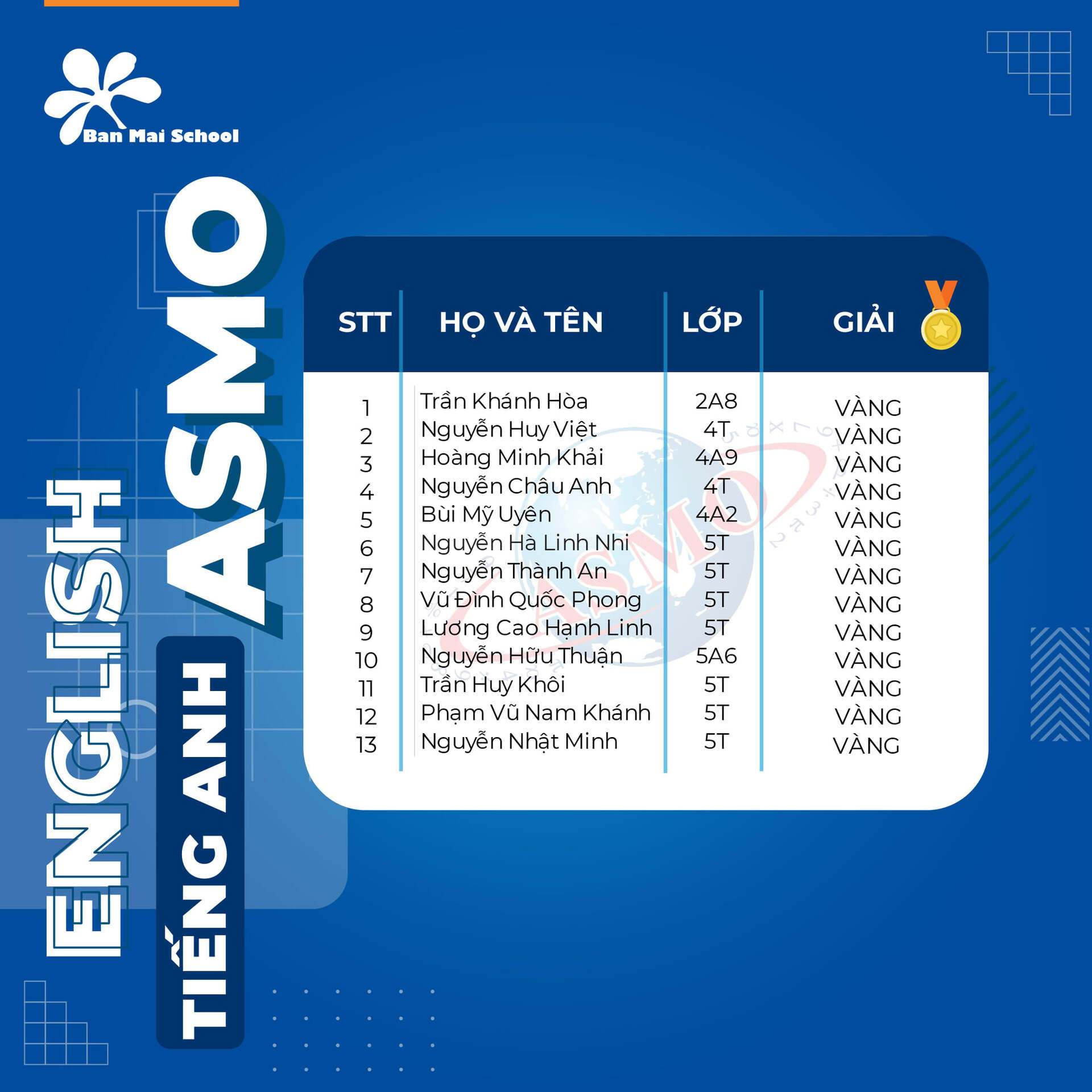 Ở vòng 1 kỳ thi ASMO 2020, các BMSers đã nhận về một CƠN MƯA THÀNH TÍCH với tổng số 432 giải thưởng ở cả 3 bộ môn: Toán, Tiếng Anh, Khoa học, trong đó gồm: